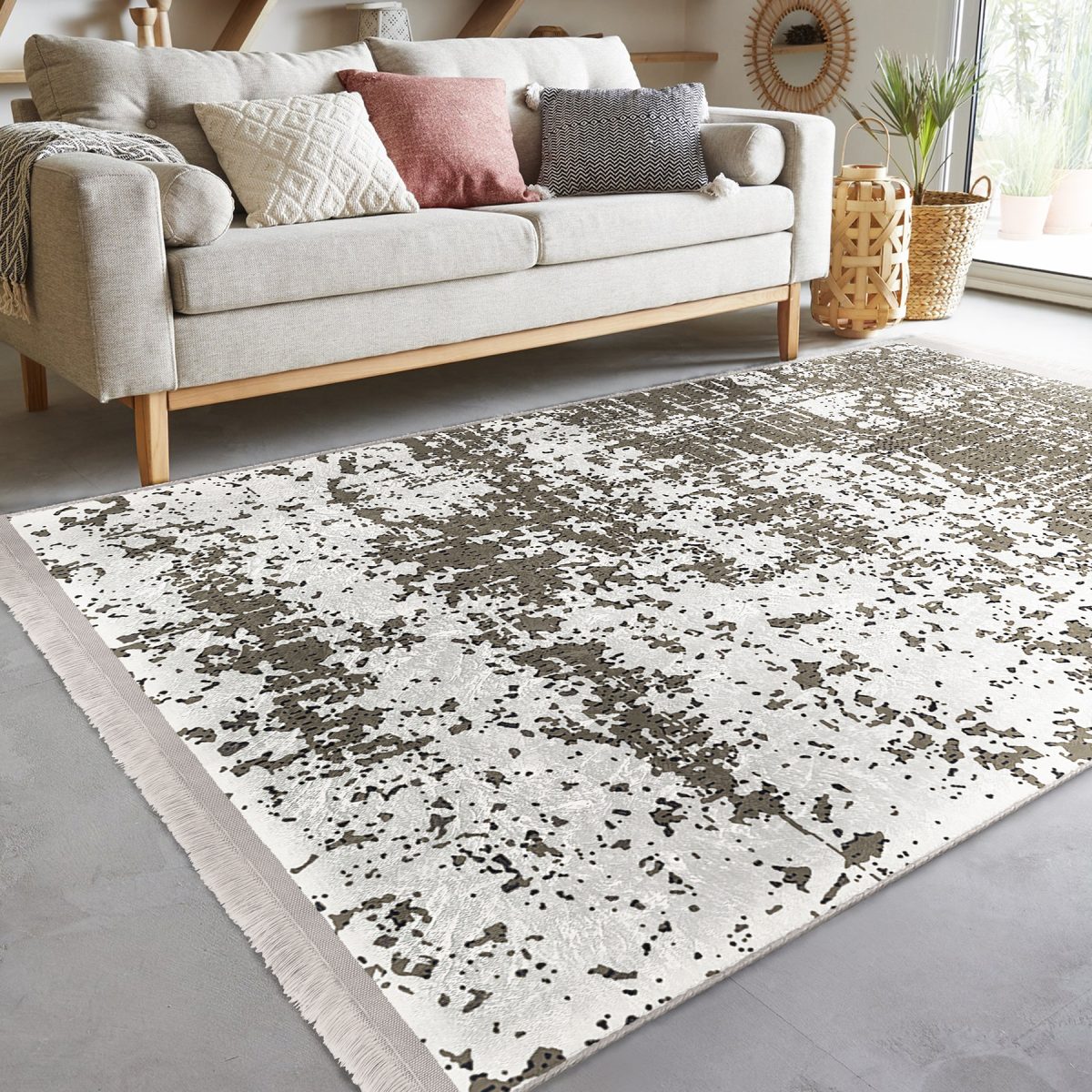 Gri Füme Zeminde Eskitme Motifli Art Sanatsal Desenli Eskitme Motifli Vintage Salon & Oturma Odası Koridor & Antre Dijital Baskılı Makinede Yıkanabilir Kaymaz Taban Saçaklı Halı