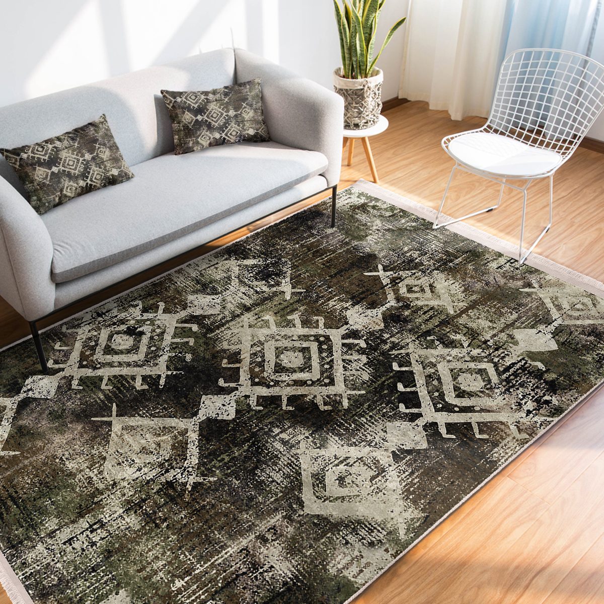 Gri Zeminde Damask Motifli Kilim Desenli Eskitme Motifli Etnik Motifler Salon & Oturma Odası Koridor & Antre Dijital Baskılı Makinede Yıkanabilir Kaymaz Taban Saçaklı Halı
