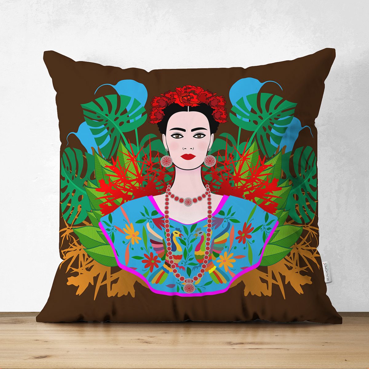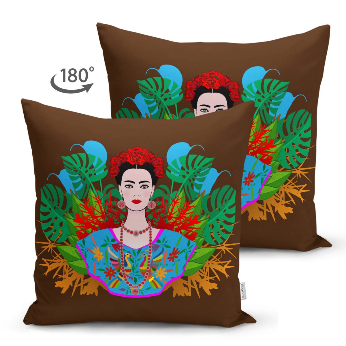 Kahverengi Zeminde Çift Taraflı Özel Tasarım Frida Kahlo Dijital Baskılı Süet Kırlent Kılıfı
