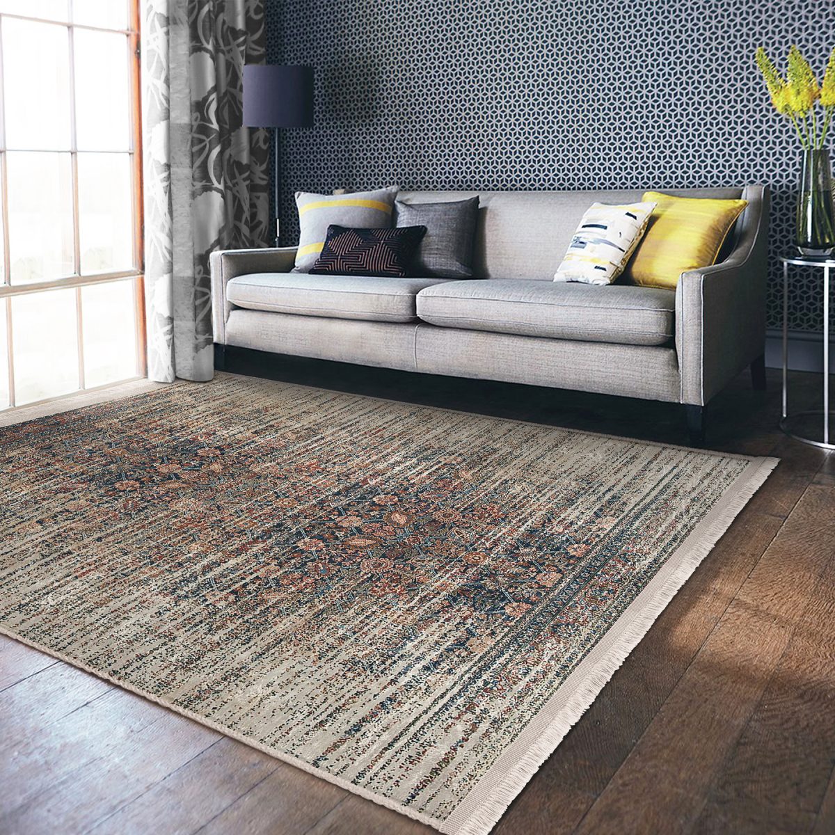 Gri Füme Zeminde Eskitme Motifli Art Sanatsal Desenli Eskitme Motifli Vintage Salon & Oturma Odası Koridor & Antre Dijital Baskılı Makinede Yıkanabilir Kaymaz Taban Saçaklı Halı