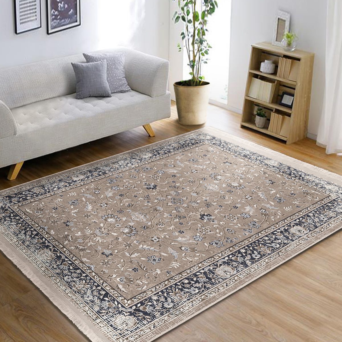 Gri Füme Zeminde Eskitme Motifli Art Sanatsal Desenli Eskitme Motifli Vintage Salon & Oturma Odası Koridor & Antre Dijital Baskılı Makinede Yıkanabilir Kaymaz Taban Saçaklı Halı