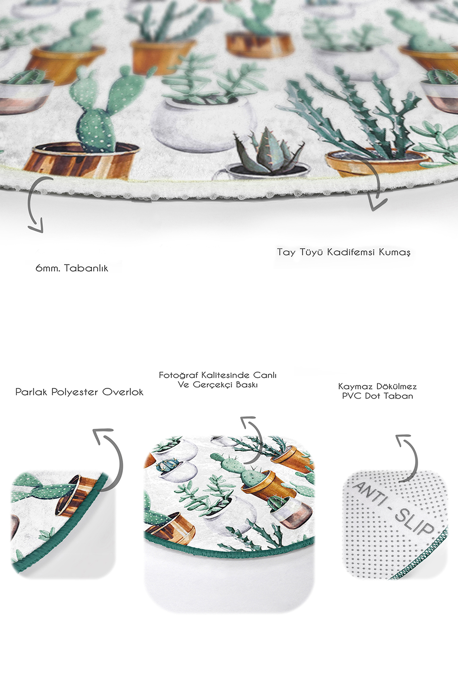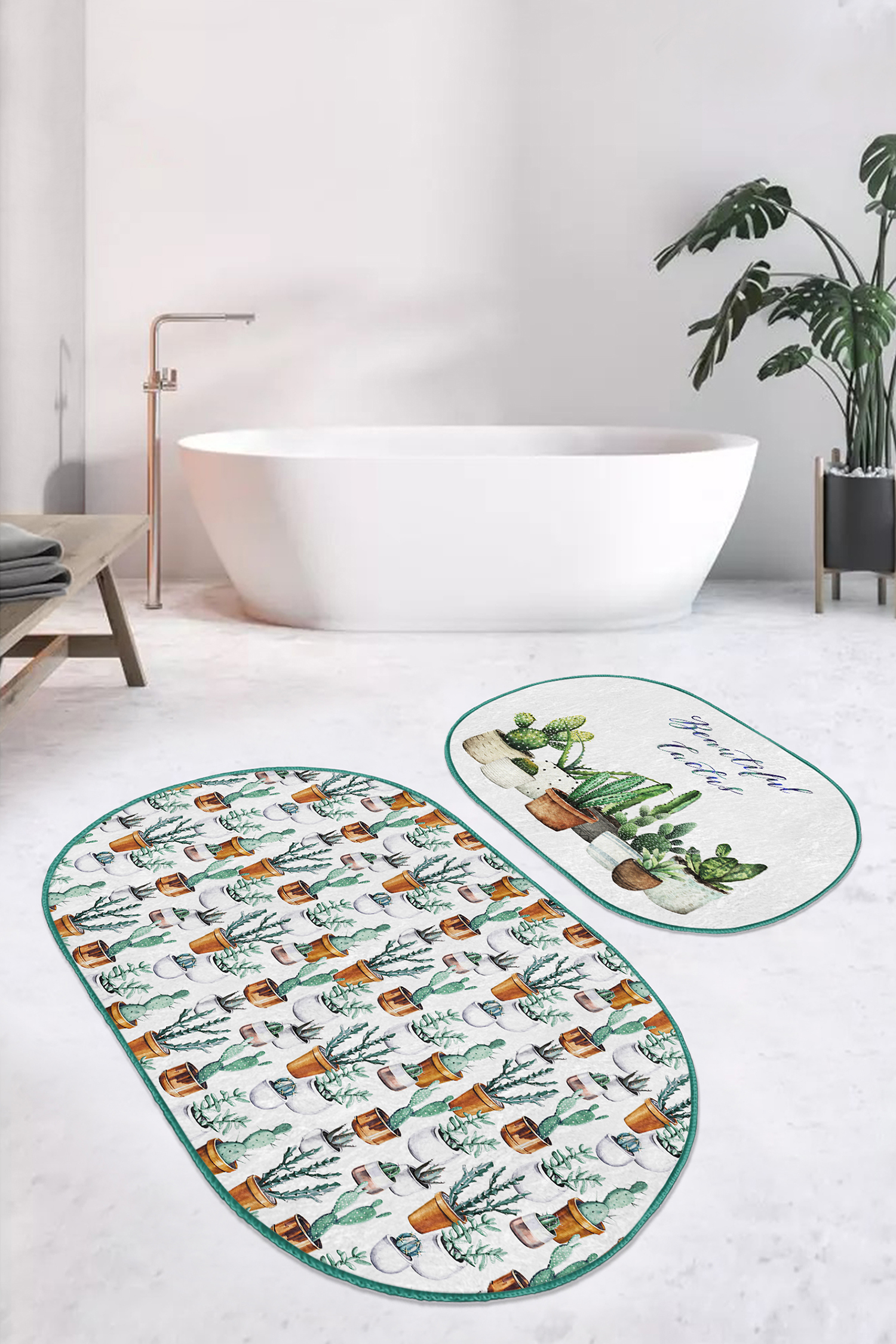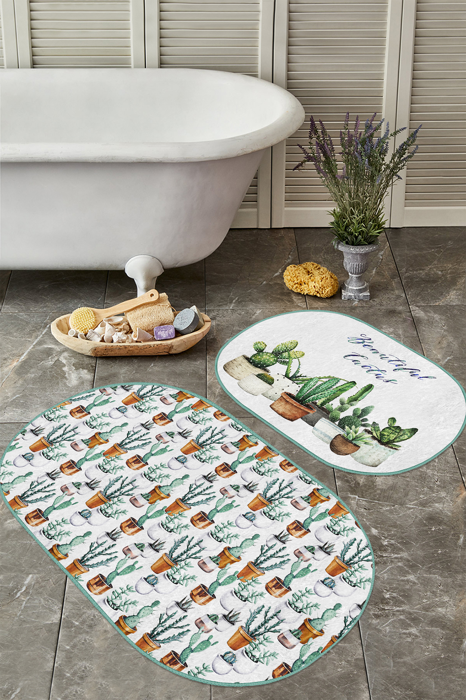 Kaktüs Motifli Dijital Baskılı 2’li Oval Kaymaz Tabanlı Banyo & Mutfak Paspas Takımı