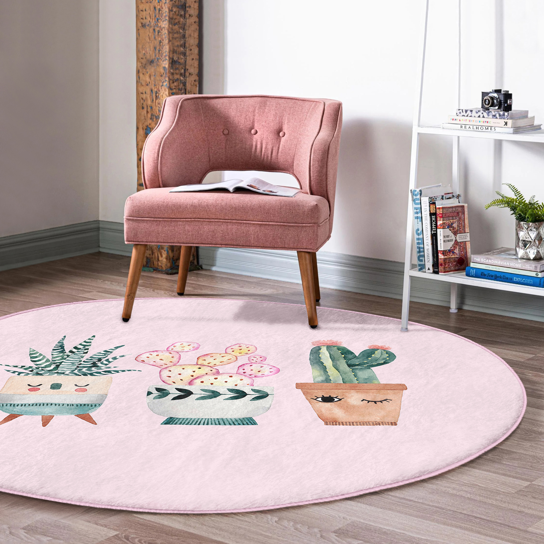 Kaktüs Motifli Dijital Baskılı Dekotarif Pembe Çocuk ve Genç Odası Yıkanabilir Kaymaz Tabanlı Yuvarlak Halı