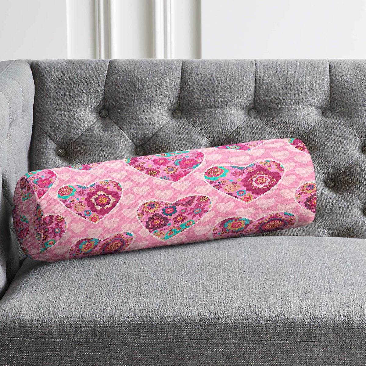 Kalp İçinde Çiçek Desenli Dijital Baskılı Özel Tasarım Modern İç Dolgulu – Fermuarlı Süet Berjer Silindir Yastık Kırlent