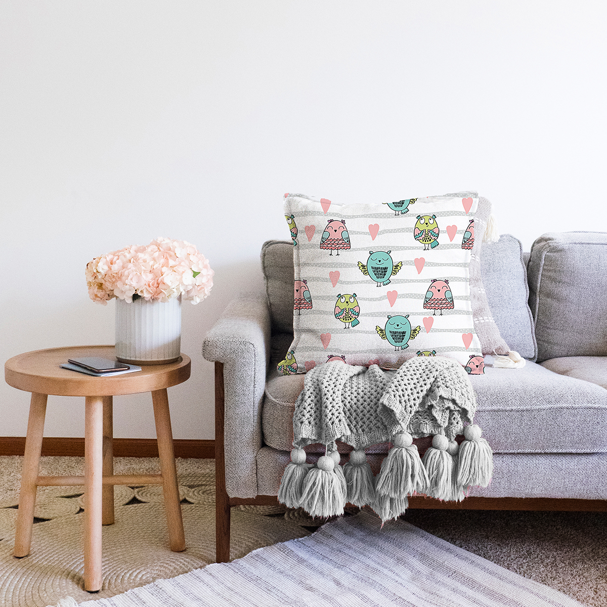 Kalp Ve Baykuş Desenli Dijital Baskılı Özel Tasarım Modern Raşel Kadife Yastık Kırlent Kılıfı