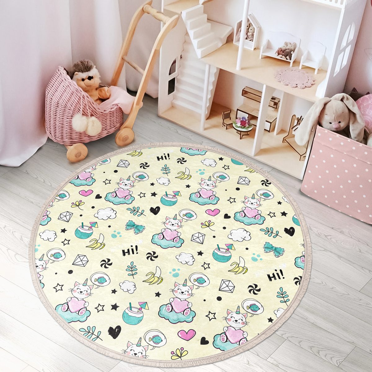 Kalpli Kedi Motifli Çocuk & Genç Odası Makinede Yıkanabilir Kaymaz Tabanlı Püsküllü Yuvarlak Çocuk Halısı