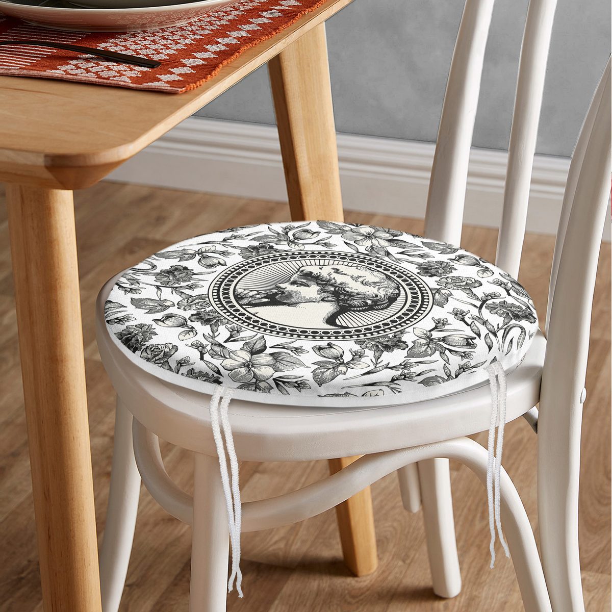 Karakalem Çiçek & Portre Desenli Dijital Baskılı Yuvarlak Fermuarlı Sandalye Minderi
