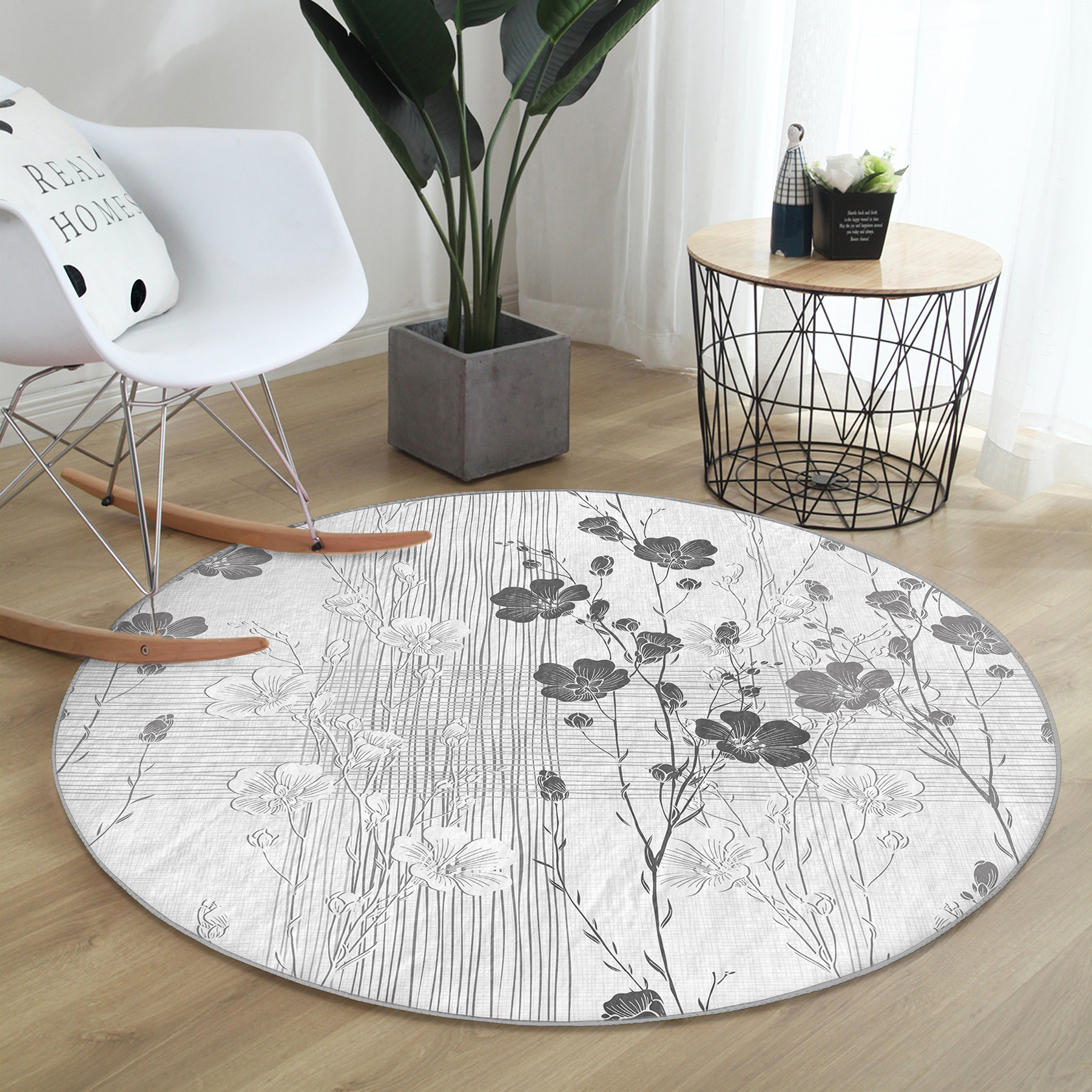Karakalem Çizimli Çiçek Tasarım Dijital Baskılı Modern Gri Mutfak Yıkanabilir Kaymaz Tabanlı Yuvarlak Halı
