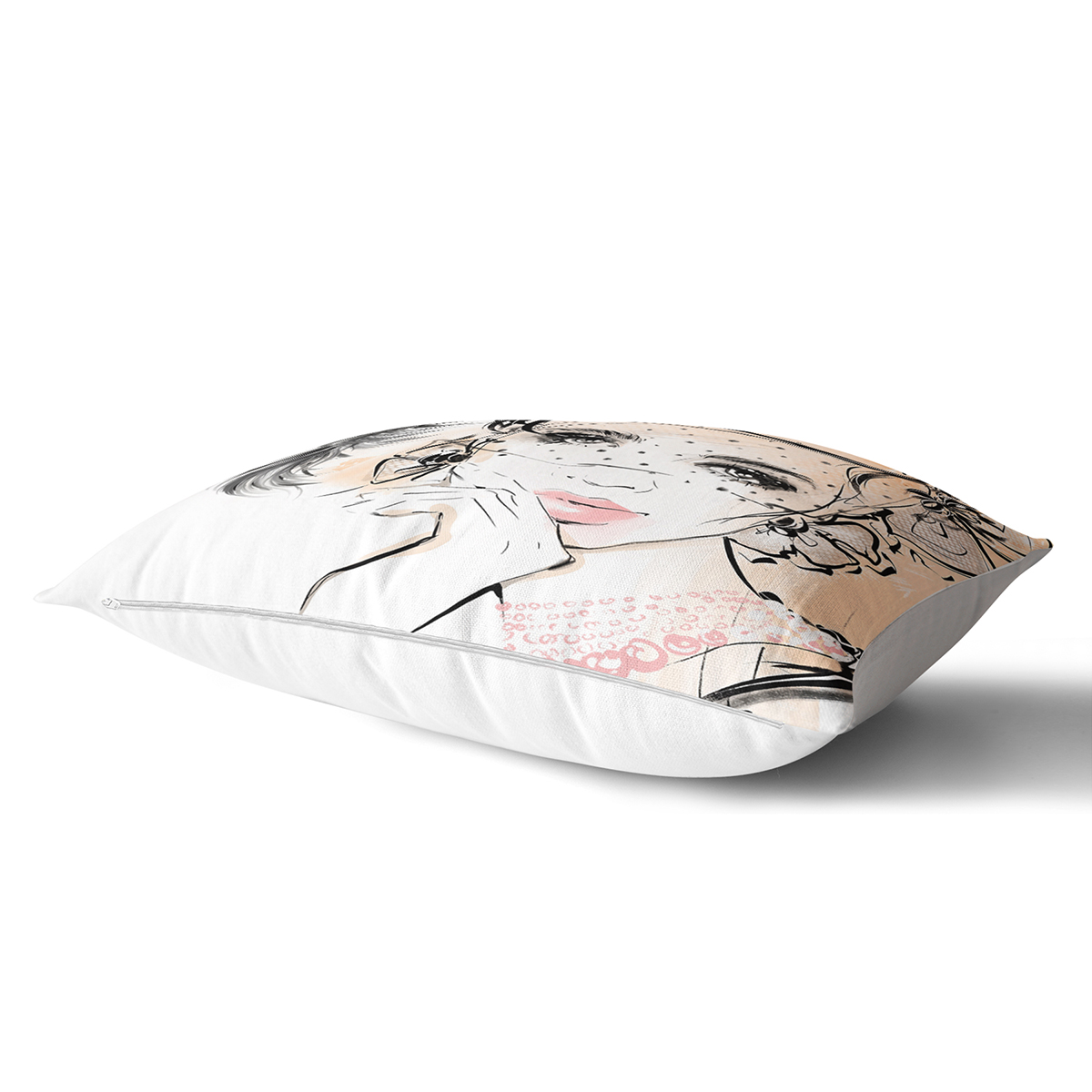 Karakalem Çizimli Fashion Women Dekoratif Dikdörtgen Kırlent Kılıfı