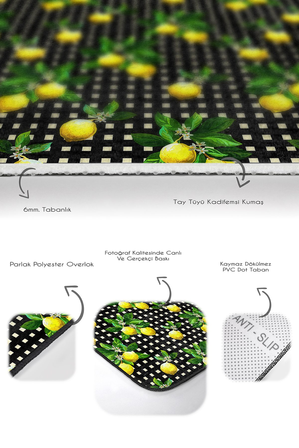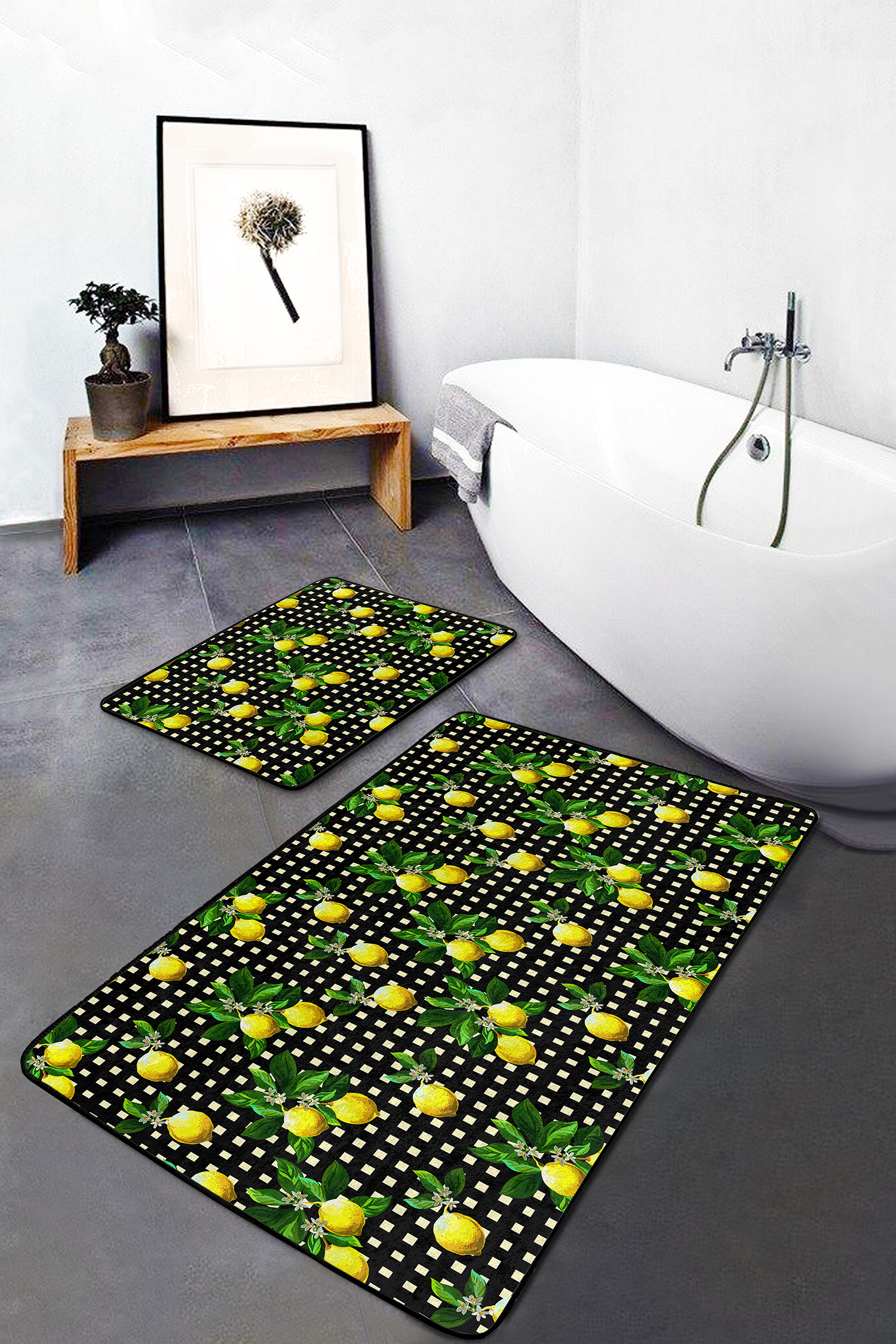 Kare Puantiye Zeminli Limon Dijital Baskılı 2’li Kaymaz Tabanlı Banyo & Mutfak Paspas Takımı