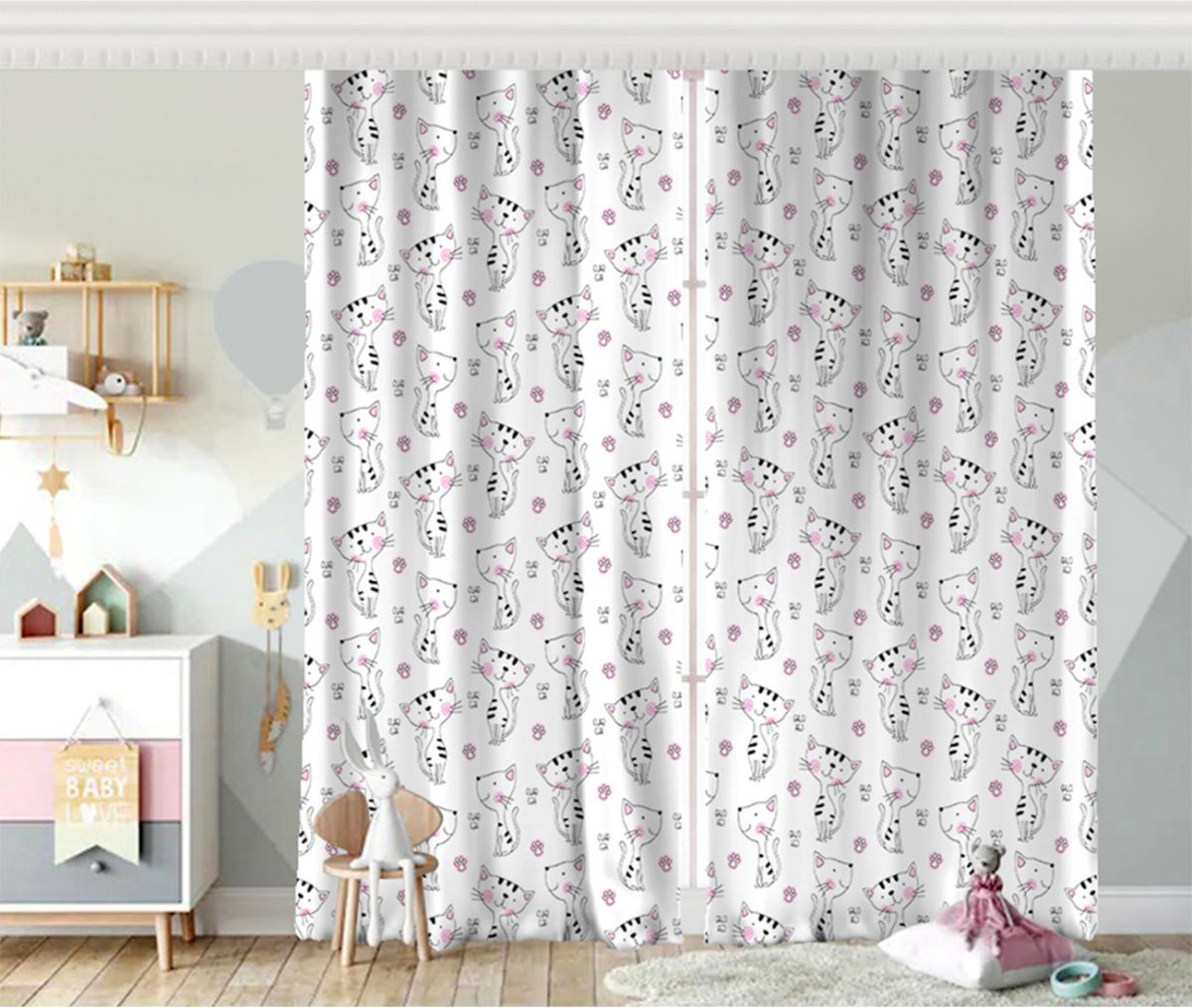 Kedi Desenli Dijital Baskılı Çocuk Odası Fon Perde