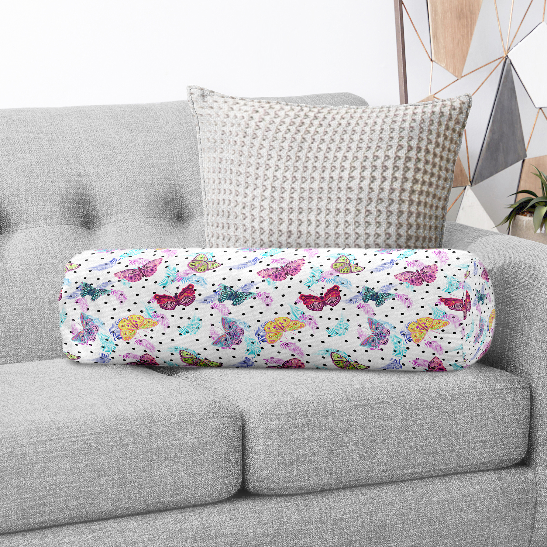 Kelebek Ve Tüy Motifli Dijital Baskılı Özel Tasarım Modern İç Dolgulu – Fermuarlı Süet Silindir Yuvarlak Yastık Kırlent