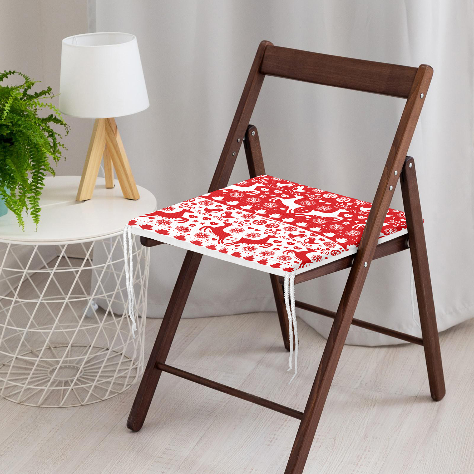 Kırmızı Beyaz Yılbaşı Geyikleri Dijital Baskılı Fermuarlı Sandalye Minderi