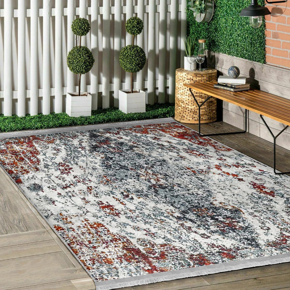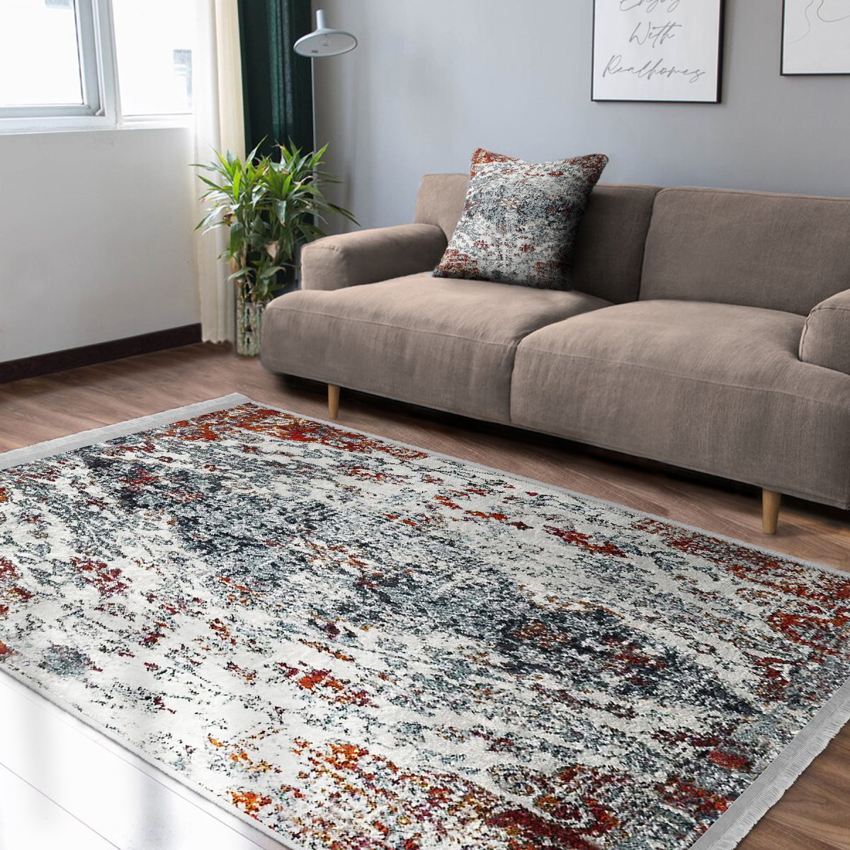 Gri Zeminde Damask Motifli Kilim Desenli Eskitme Motifli Etnik Motifler Salon & Oturma Odası Koridor & Antre Dijital Baskılı Makinede Yıkanabilir Kaymaz Taban Saçaklı Halı