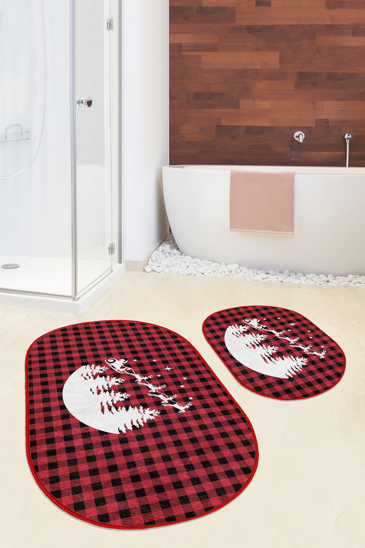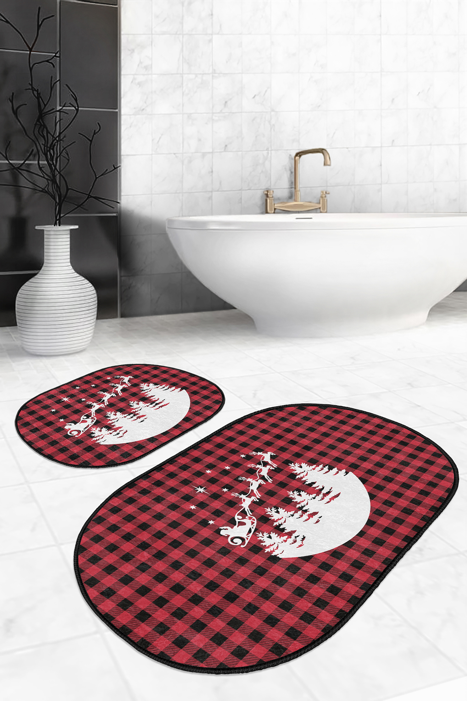 Kırmızı Ekose Motifli Yılbaşı Desenli 2’li Oval Kaymaz Tabanlı Banyo Paspası & Klozet Takımı