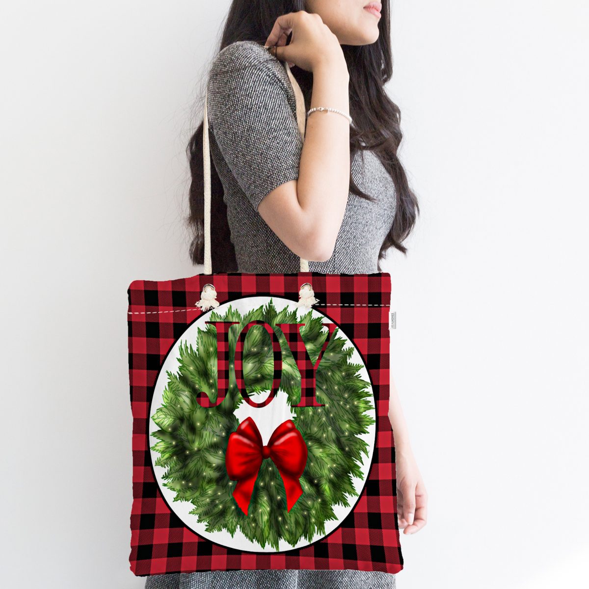 Kırmızı Ekose Yılbaşı Desen Joy Motifli Fermuarlı Kumaş Omuz Çantası Realhomes
