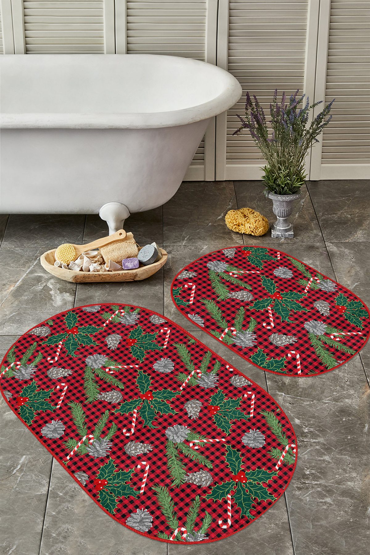Kırmızı Ekose Yılbaşı Tasaımlı 2’li Oval Kaymaz Tabanlı Banyo Paspas Takımı & Mutfak Paspas Seti