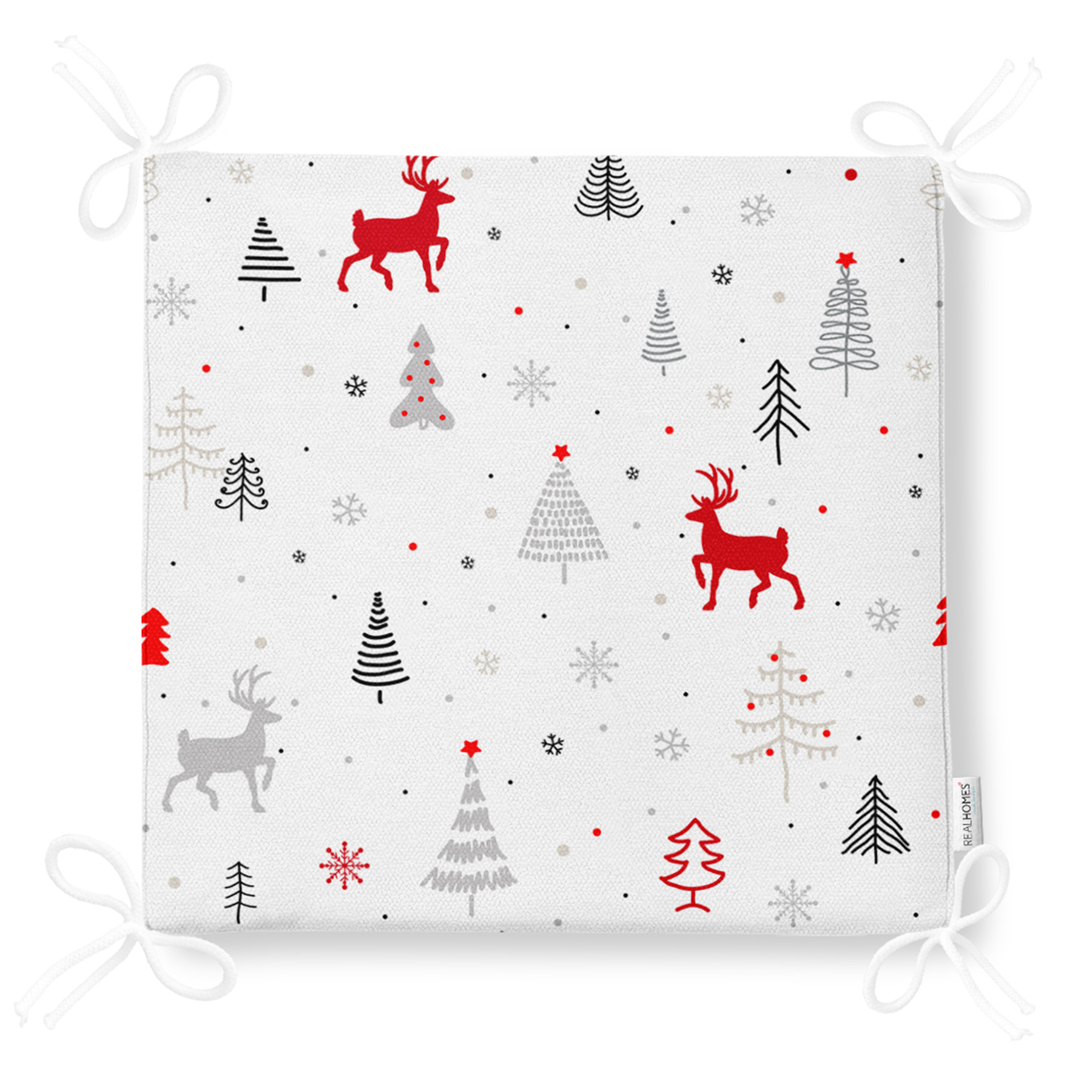Kırmızı Geyikler ve Ağaçlar Yılbaşı Konseptli Dijital Baskılı Fermuarlı Sandalye Minderi Realhomes