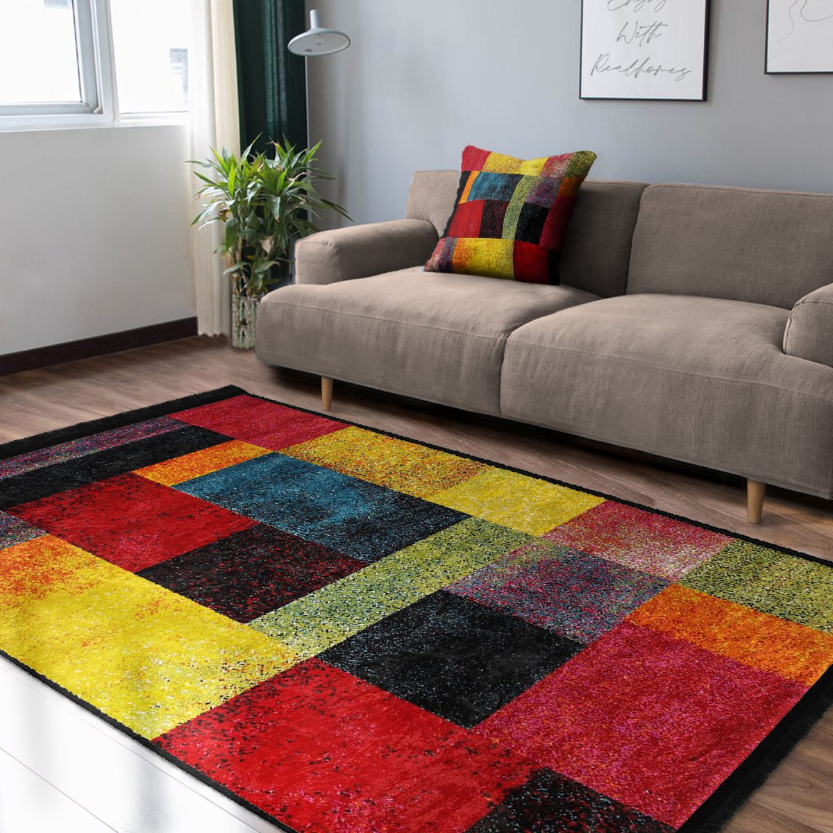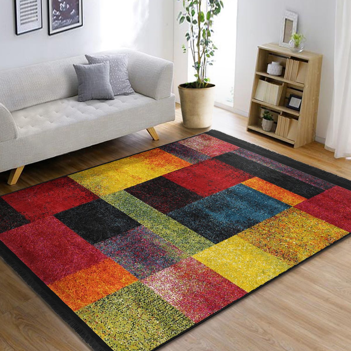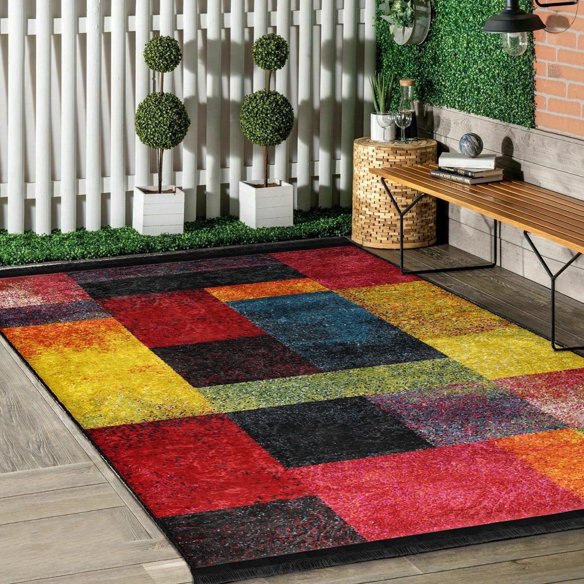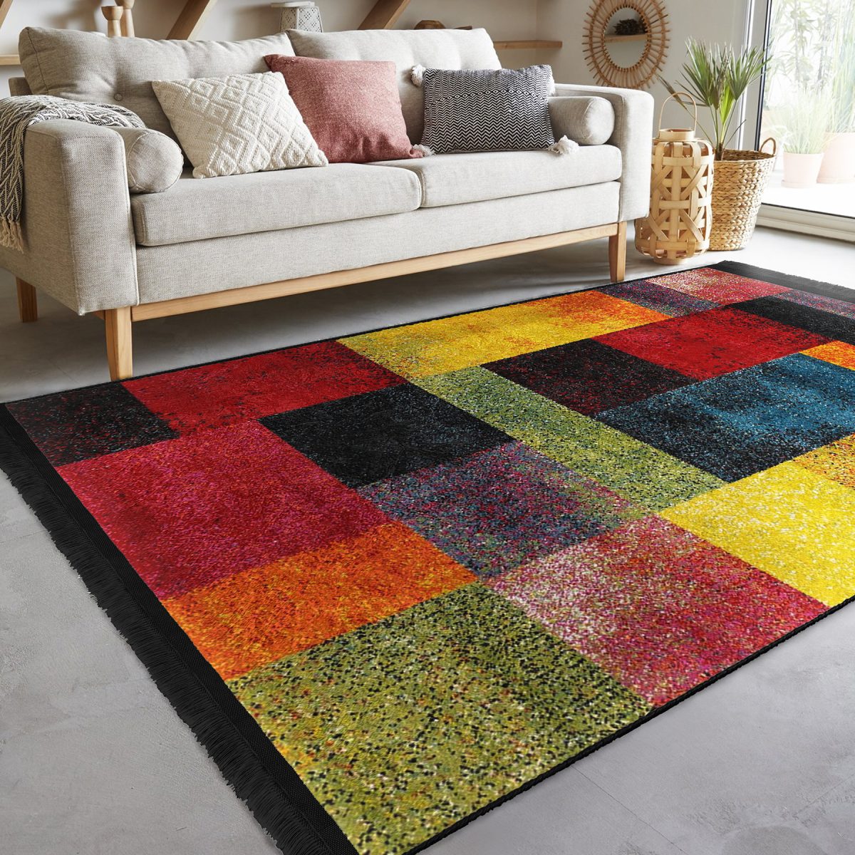 Renkli Zeminde Kilim Motifli Baklava Desenli Avangarde Vintage Koridor & Antre Salon & Oturma Odası Dijital Baskılı Makinede Yıkanabilir Kaymaz Taban Saçaklı Halı
