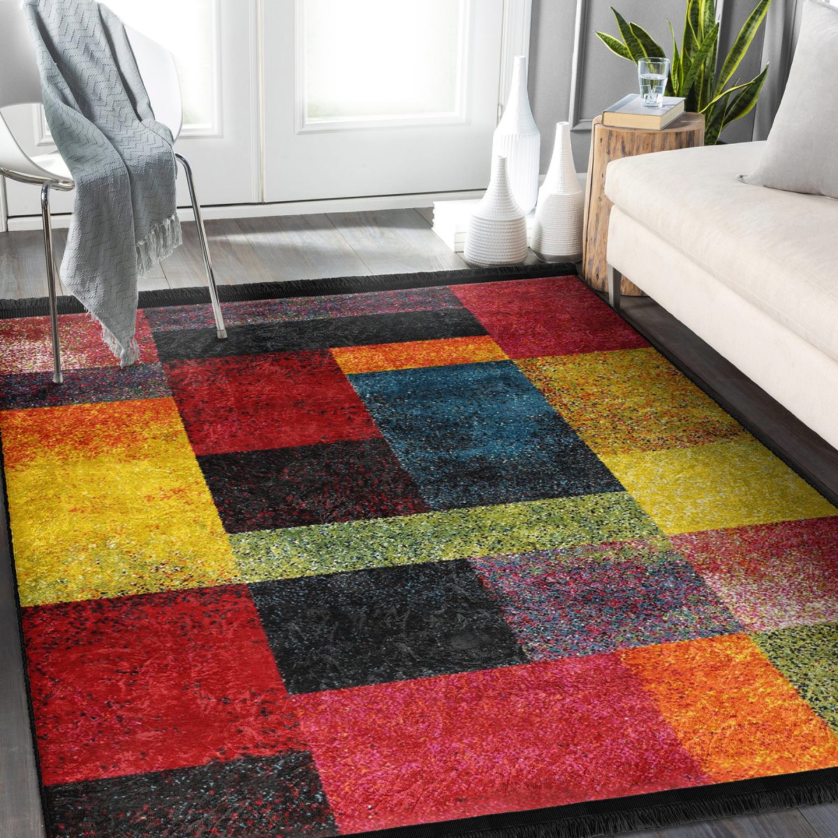 RealHomes Dijital Baskılı Kaymaz Tabanlı Deluxe Halılar, kumaş seçimi ve püsküllü dikiş detaylarıyla şık bir dekorasyon öğesi olarak kullanımınıza sunulmaktadır. Her bir desen RealHomes tasarımcıları tarafından özenle tasarlanmış ve satışa sunulmuştur. Fotoğraf kalitesinde canlı ve gerçekçi baskılarımız yıkamaya ve kullanıma bağlı olarak solma yapmaz, yıllar boyu ilk günkü özelliğini korur.
