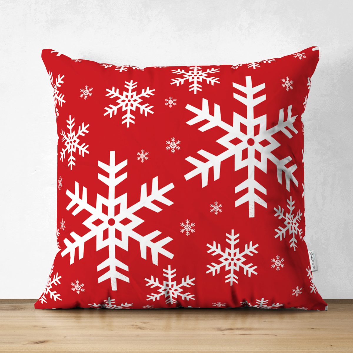 Kırmızı Zemin Kar Tanesi Özel Tasarım Yılbaşı Temalı Süet Yastık Kırlent Kılıfı