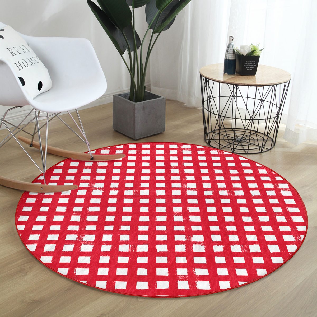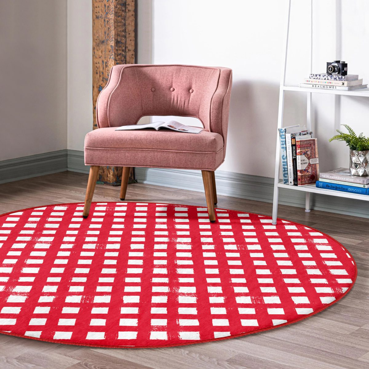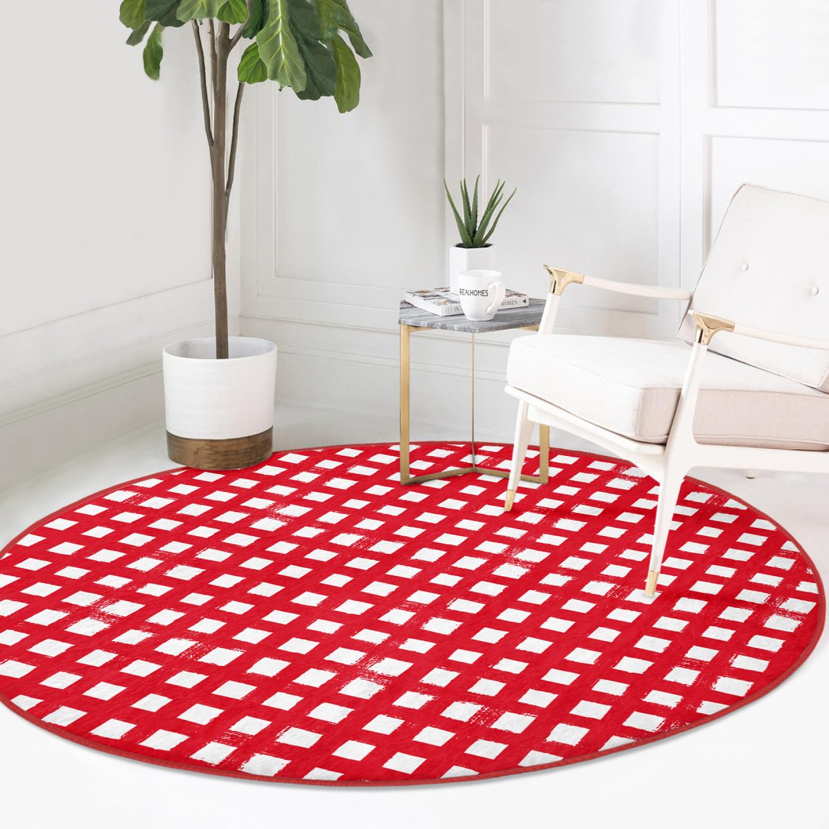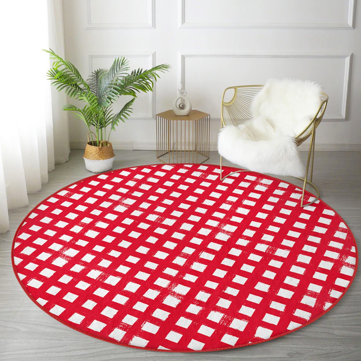Kırmızı Zeminde Geometrik Kare Motifli Bordo Salon ve Oturma Odası Yıkanabilir Kaymaz Tabanlı Yuvarlak Halı