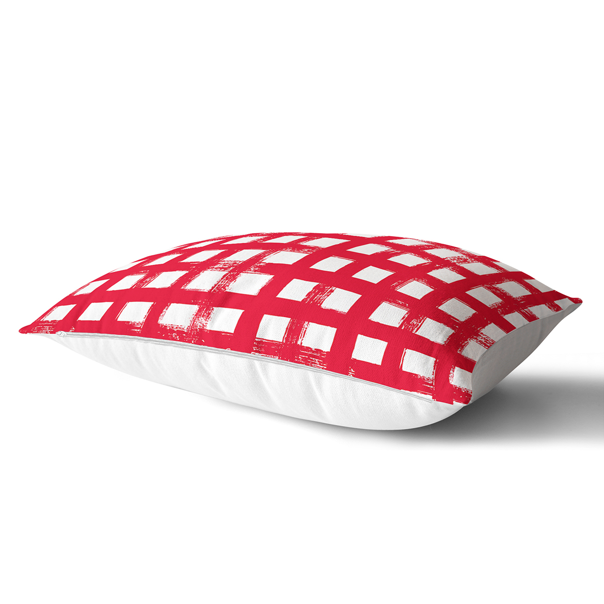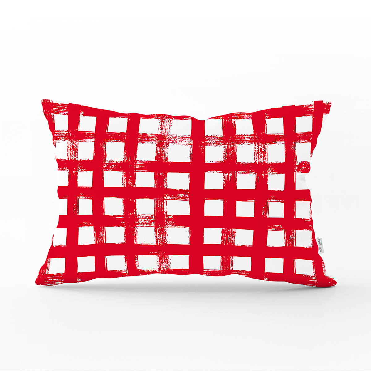 Kırmızı Zeminde Geometrik Kare Motifli Dekoratif Dikdörtgen Yastık Kılıfı