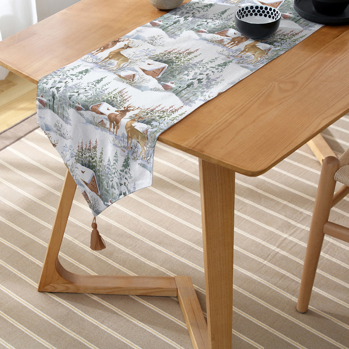Kış Temalı Bağ Evi & Geyik Tasarımlı Dijital Baskılı Modern Püsküllü Şönil Üçgen Runner