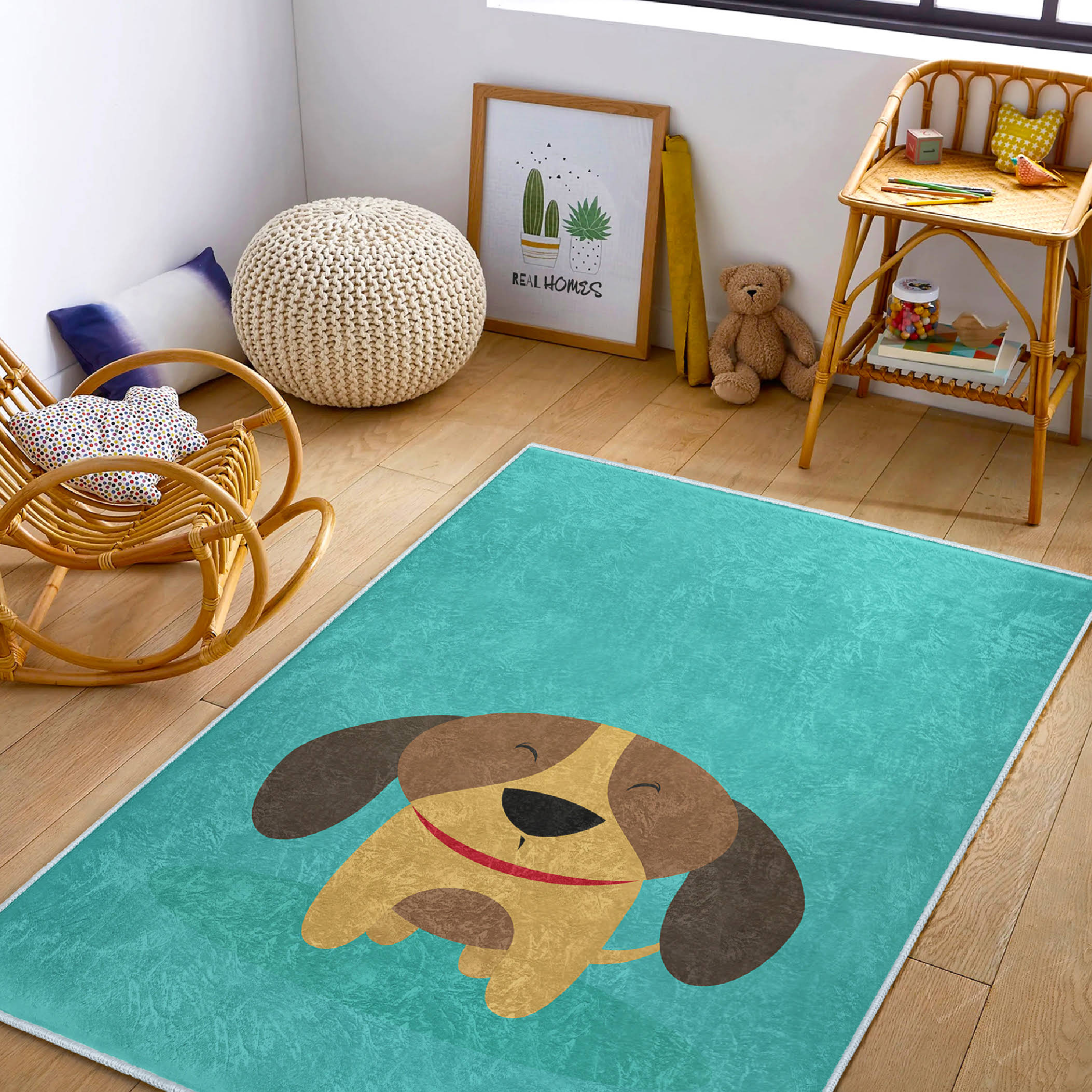 Köpek Desenli Çocuk & Genç Odası Makinede Yıkanabilir Kaymaz Tabanlı Dekoratif Pamuk Tabanlı Dikdörtgen & Kare Çocuk Odası Halısı