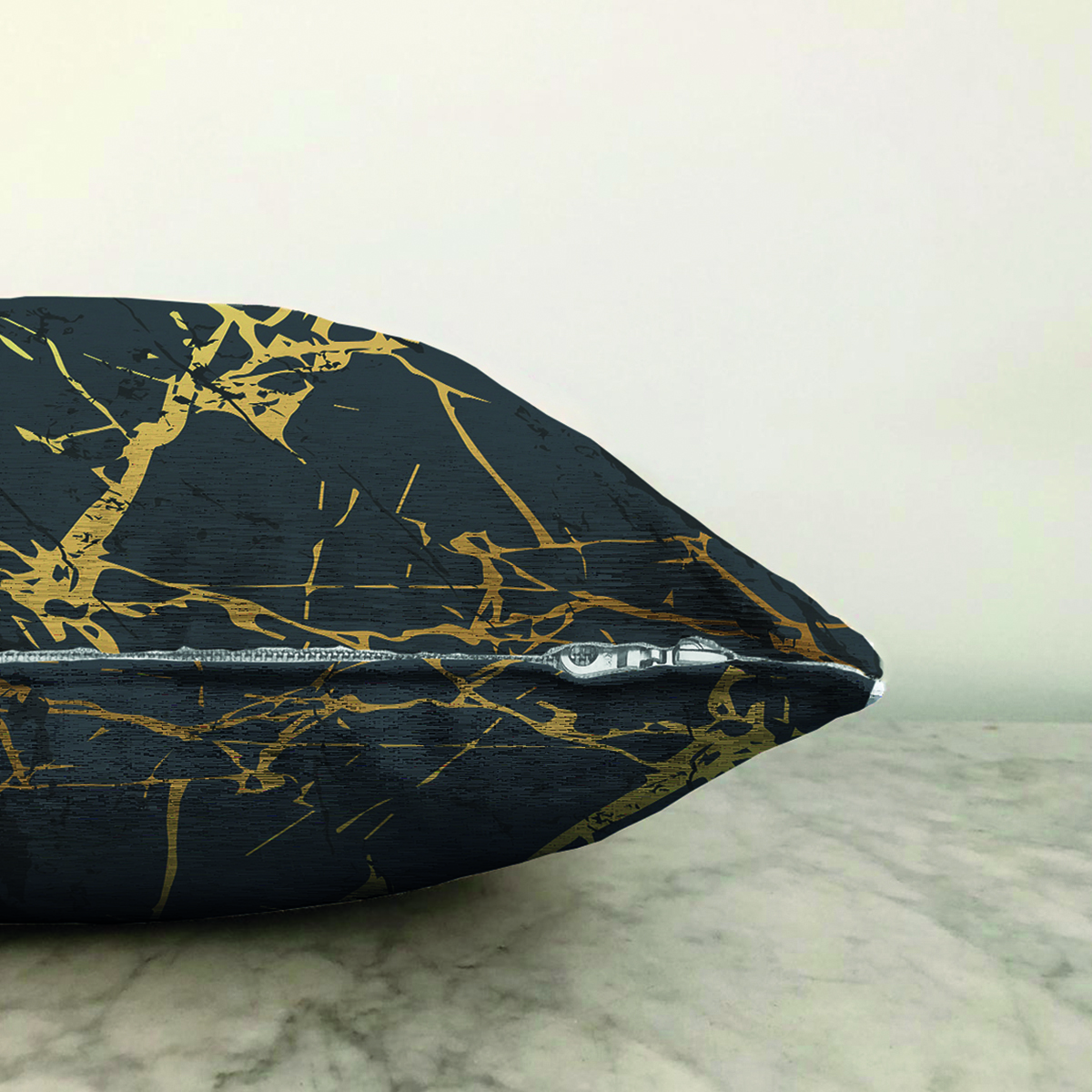 Koyu Zeminde Altın Rengi Mermer Desenli Dijital Baskılı Dekoratif Raşel Kadife Yastık Kırlent Kılıfı