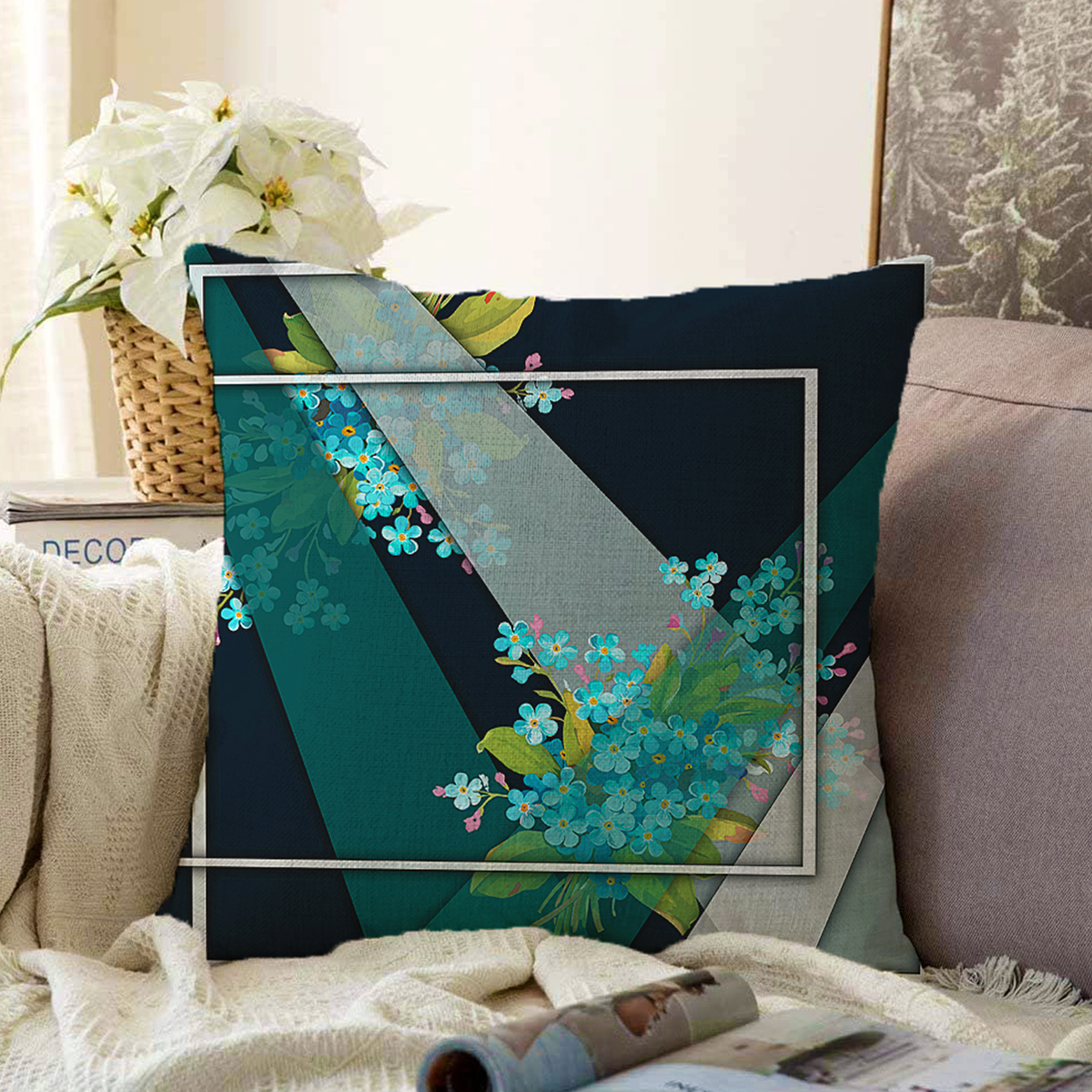 Koyu Zeminde Mavi Çiçek Motifli Özel Tasarım Dijital Baskılı Modern Raşel Kadife Yastık Kırlent Kılıfı