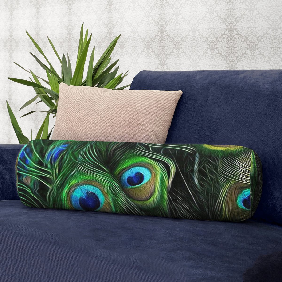 Koyu Zeminde Renkli Tüyler Özel Tasarımlı Dekoratif İç Dolgulu Süet Silindir Yastık Kırlent – Bel Yastığı
