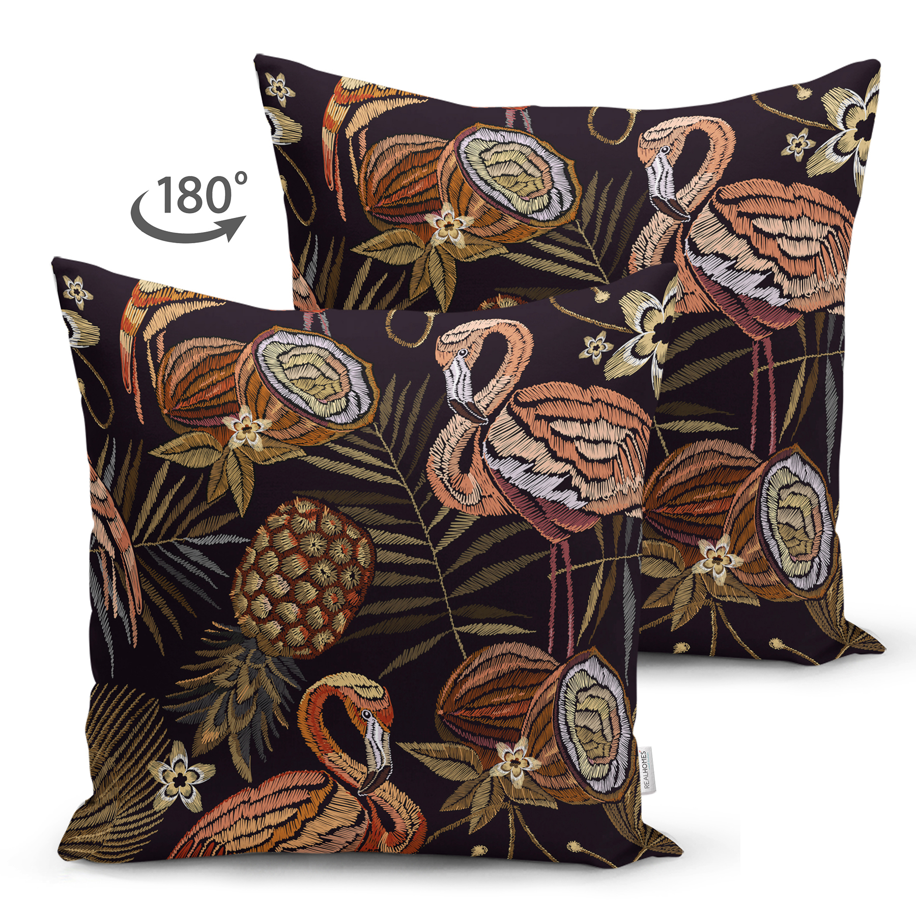 Koyu Zeminli Flamingo Ananas Motifli Süet Yastık Kırlent Kılıfı Realhomes
