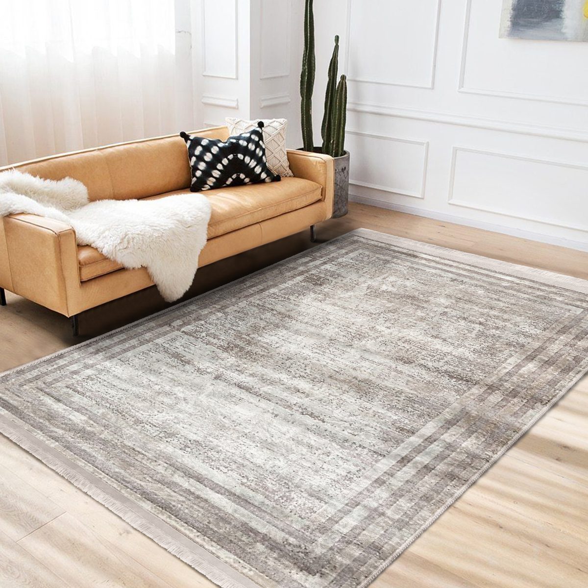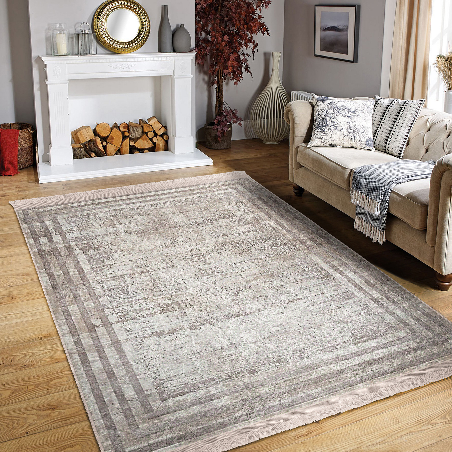 Krem – Bej Zeminde Çerçeveli Motifli Eskitme Desenli Eskitme Motifli Sade & Şık Salon & Oturma Odası Yatak Odası Dijital Baskılı Makinede Yıkanabilir Kaymaz Taban Saçaklı Halı