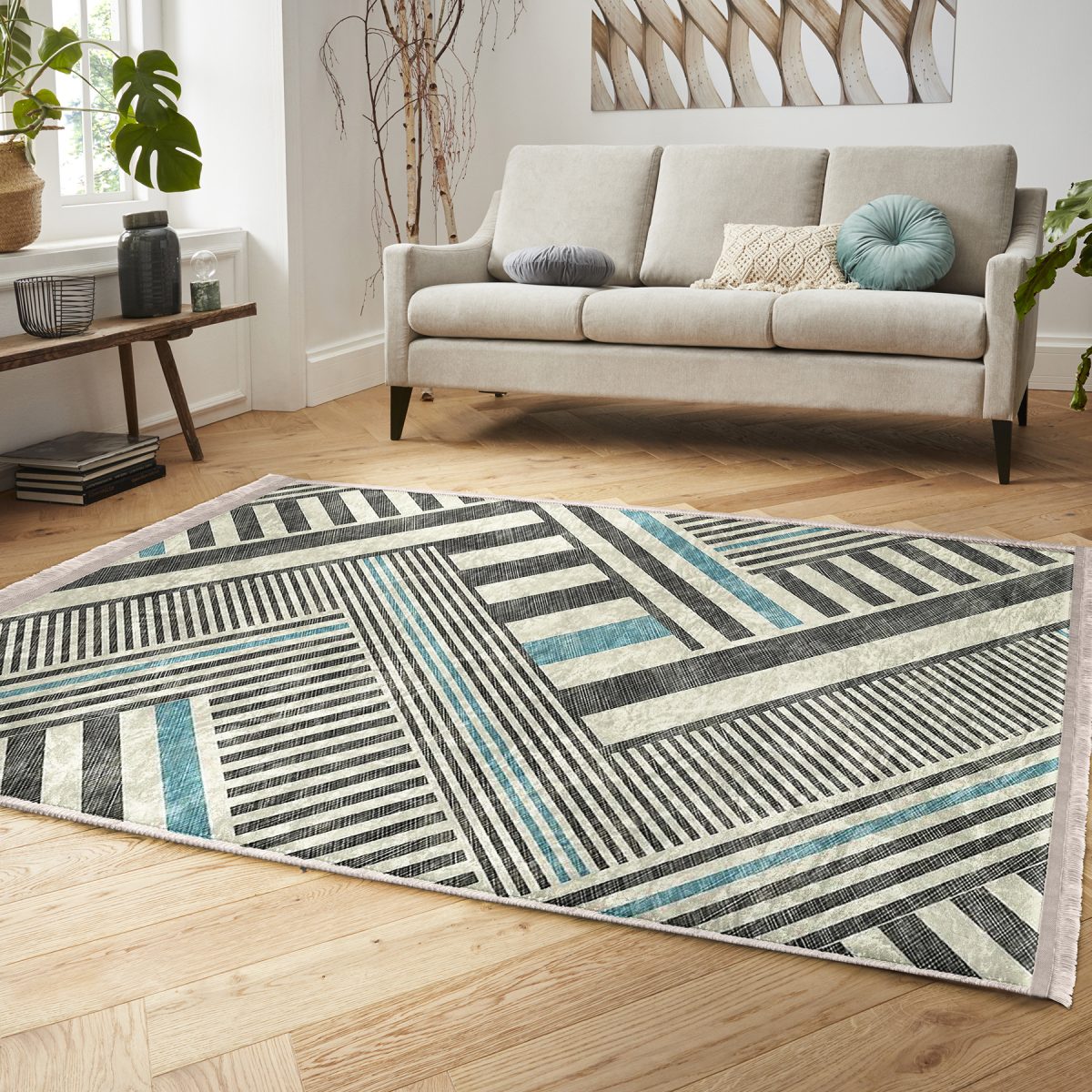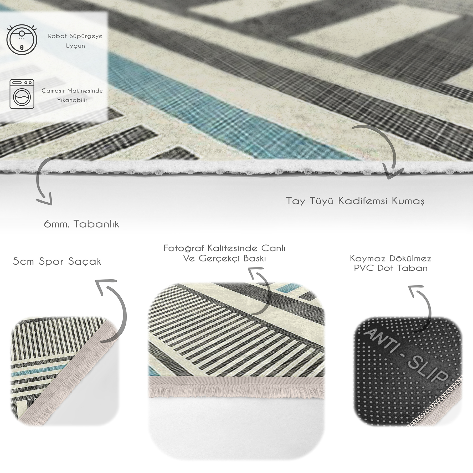 Krem – Füme Zeminde Geometrik Motifli Kanvas Desenli Sade & Şık Geometrik Koridor & Antre Salon & Oturma Odası Dijital Baskılı Makinede Yıkanabilir Kaymaz Taban Saçaklı Halı