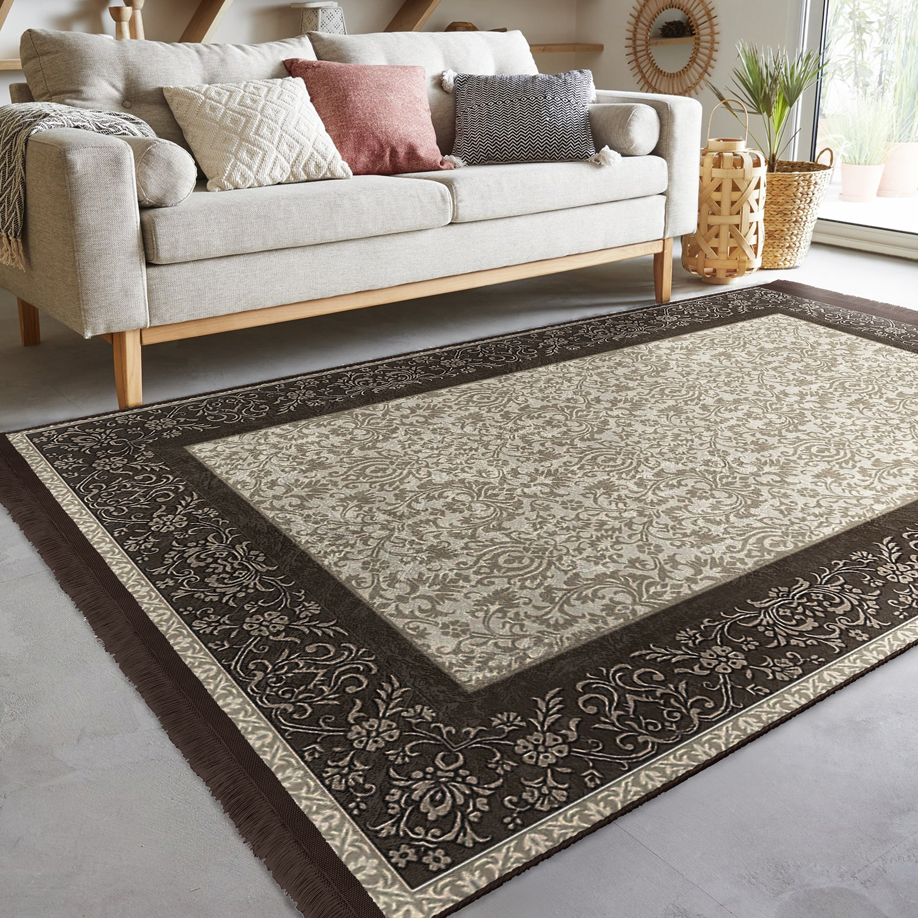 Krem – Kahverengi Zeminde Çerçeveli Motifli Geleneksel Desenli Vintage Avangarde Salon & Oturma Odası Koridor & Antre Dijital Baskılı Makinede Yıkanabilir Kaymaz Taban Saçaklı Halı