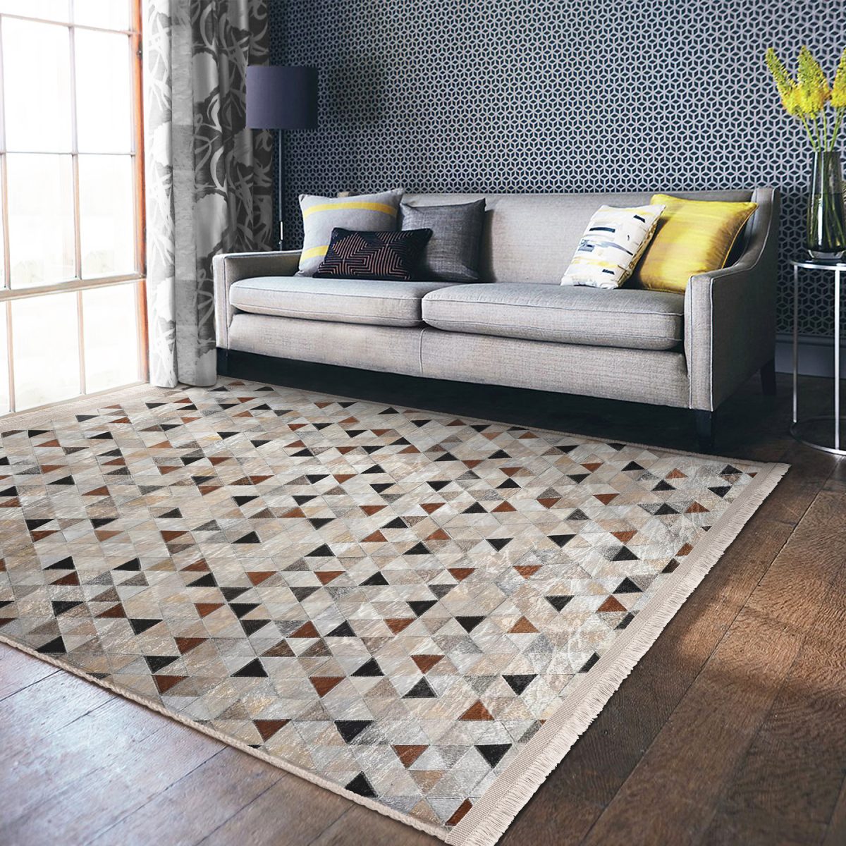 RealHomes Dijital Baskılı Kaymaz Tabanlı Deluxe Halılar, kumaş seçimi ve püsküllü dikiş detaylarıyla şık bir dekorasyon öğesi olarak kullanımınıza sunulmaktadır. Her bir desen RealHomes tasarımcıları tarafından özenle tasarlanmış ve satışa sunulmuştur. Fotoğraf kalitesinde canlı ve gerçekçi baskılarımız yıkamaya ve kullanıma bağlı olarak solma yapmaz, yıllar boyu ilk günkü özelliğini korur.
