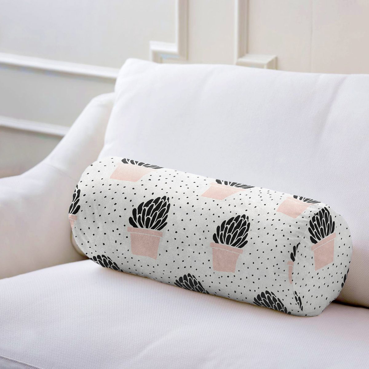Krem Kumlama Zemin Kaktüs Tasarımlı Dijital Baskılı Modern İç Dolgulu Süet Silindir Yastık Kırlent – Bel Yastığı