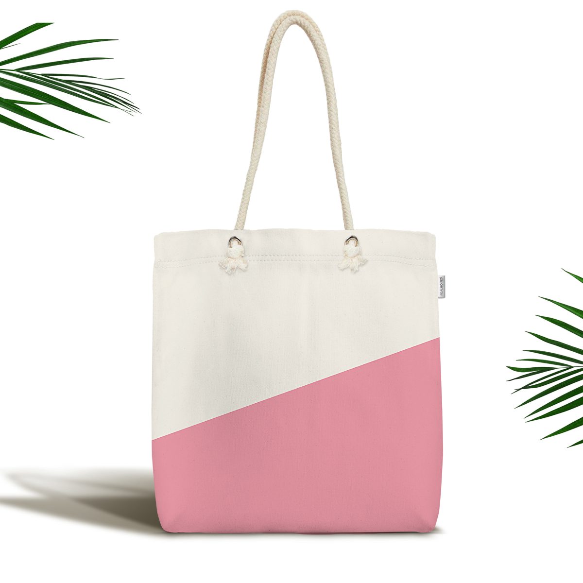 Krem & Pembe Düz Renkli Dijital Baskılı Dekoratif Fermuarlı Kumaş Plaj Çantası