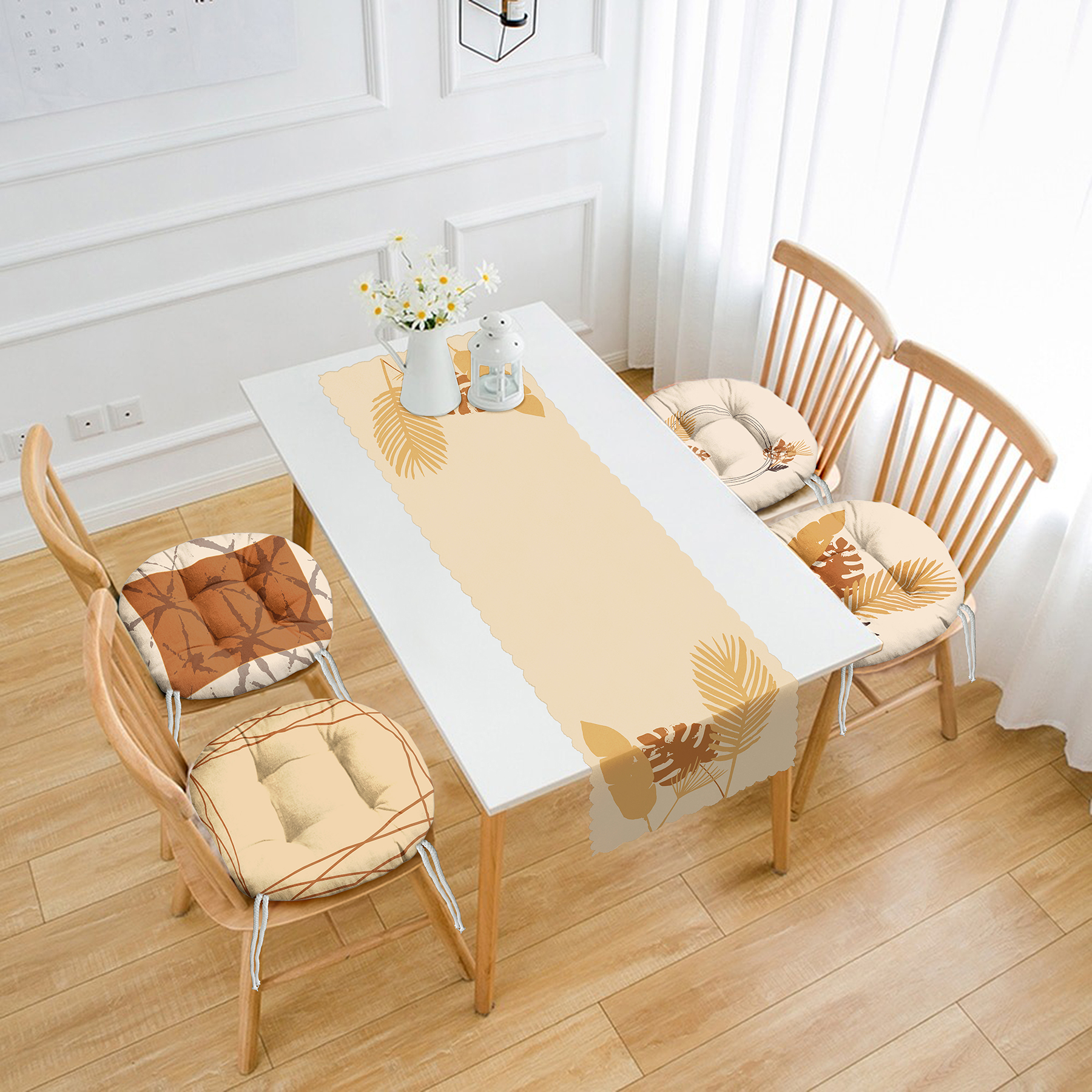 Krem Renkli Özel Tasarım 4 Yuvarlak Pofuduk Sandalye Minderi ve 1 Runner Seti Realhomes