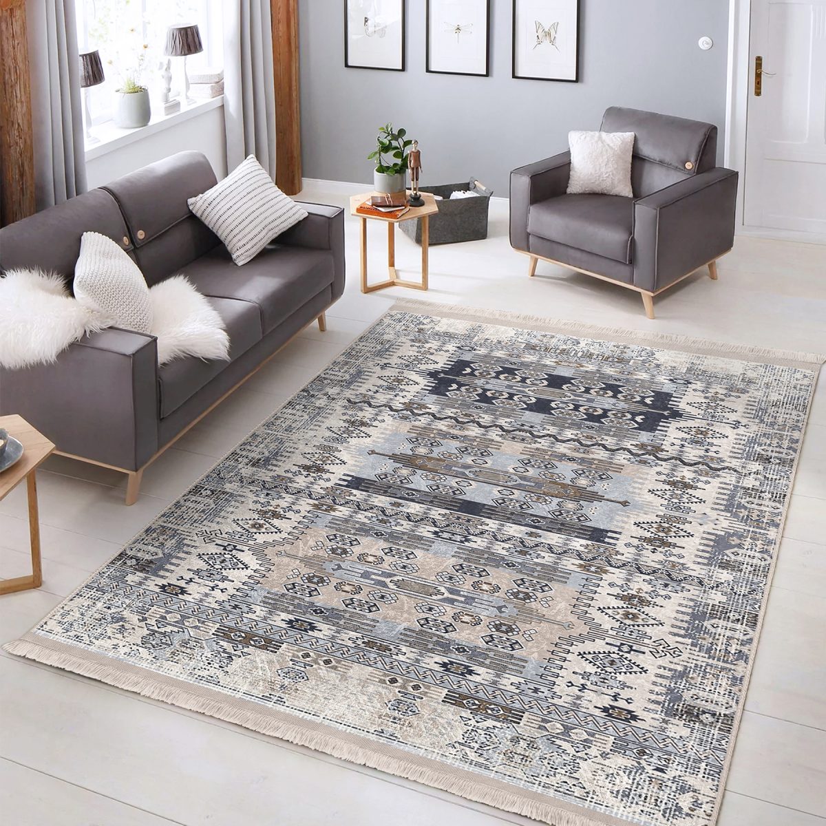 Gri Füme Zeminde Eskitme Motifli Art Sanatsal Desenli Eskitme Motifli Vintage Salon & Oturma Odası Koridor & Antre Dijital Baskılı Makinede Yıkanabilir Kaymaz Taban Saçaklı Halı