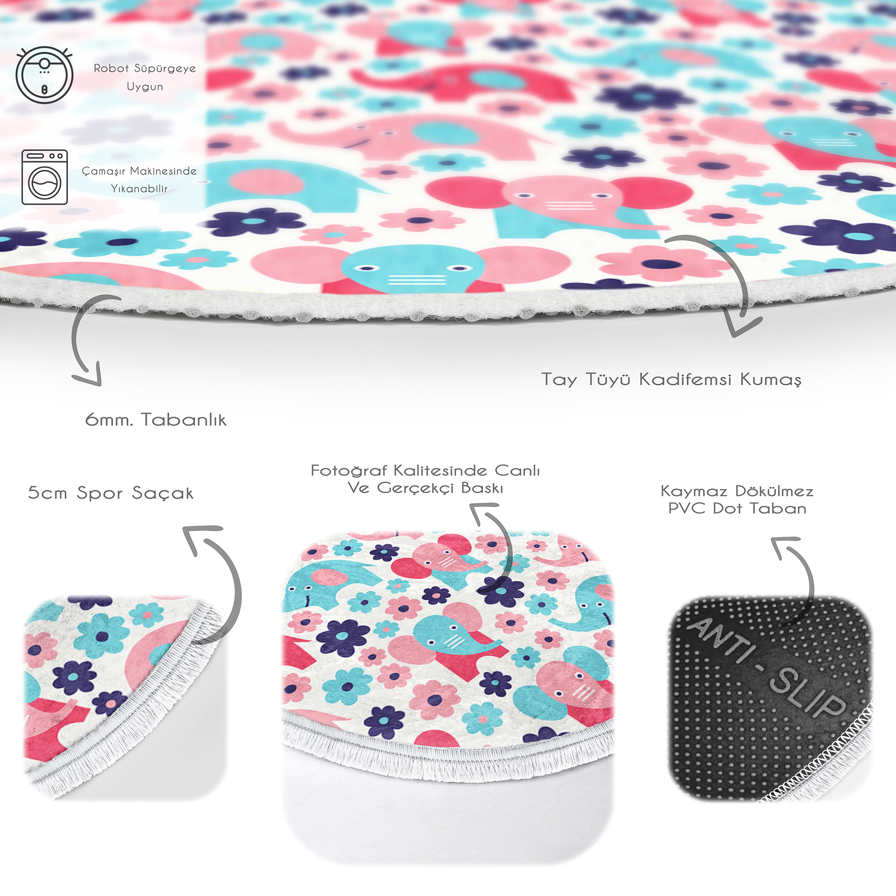 Krem Zeminde Fil Ve Çiçek Desenli Çocuk & Genç Odası Makinede Yıkanabilir Kaymaz Tabanlı Püsküllü Yuvarlak Çocuk Halısı