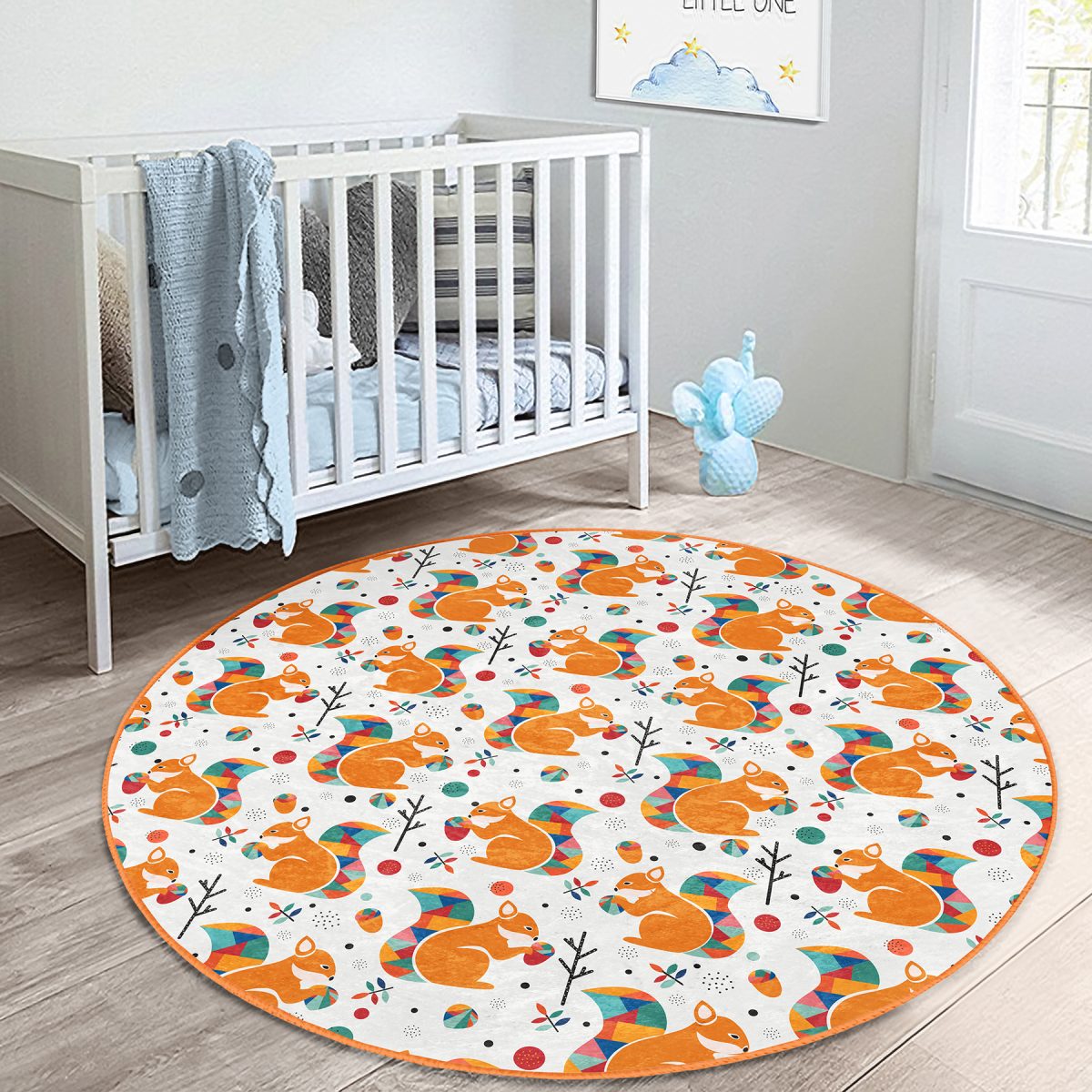Krem Zeminde Fındık Kurdu Sincap Çocuk & Genç Odası Makinede Yıkanabilir Kaymaz Tabanlı Yuvarlak Çocuk Halısı
