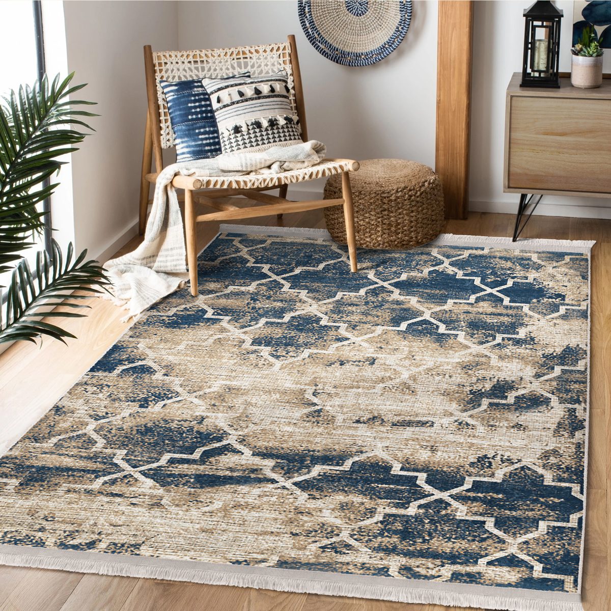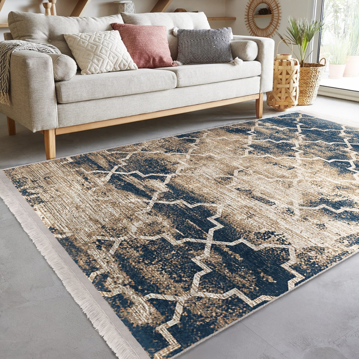 Krem Zeminde Morrocan Motifli Otantik Desenli Geometrik Eskitme Motifli Koridor & Antre Salon & Oturma Odası Dijital Baskılı Makinede Yıkanabilir Kaymaz Taban Saçaklı Halı