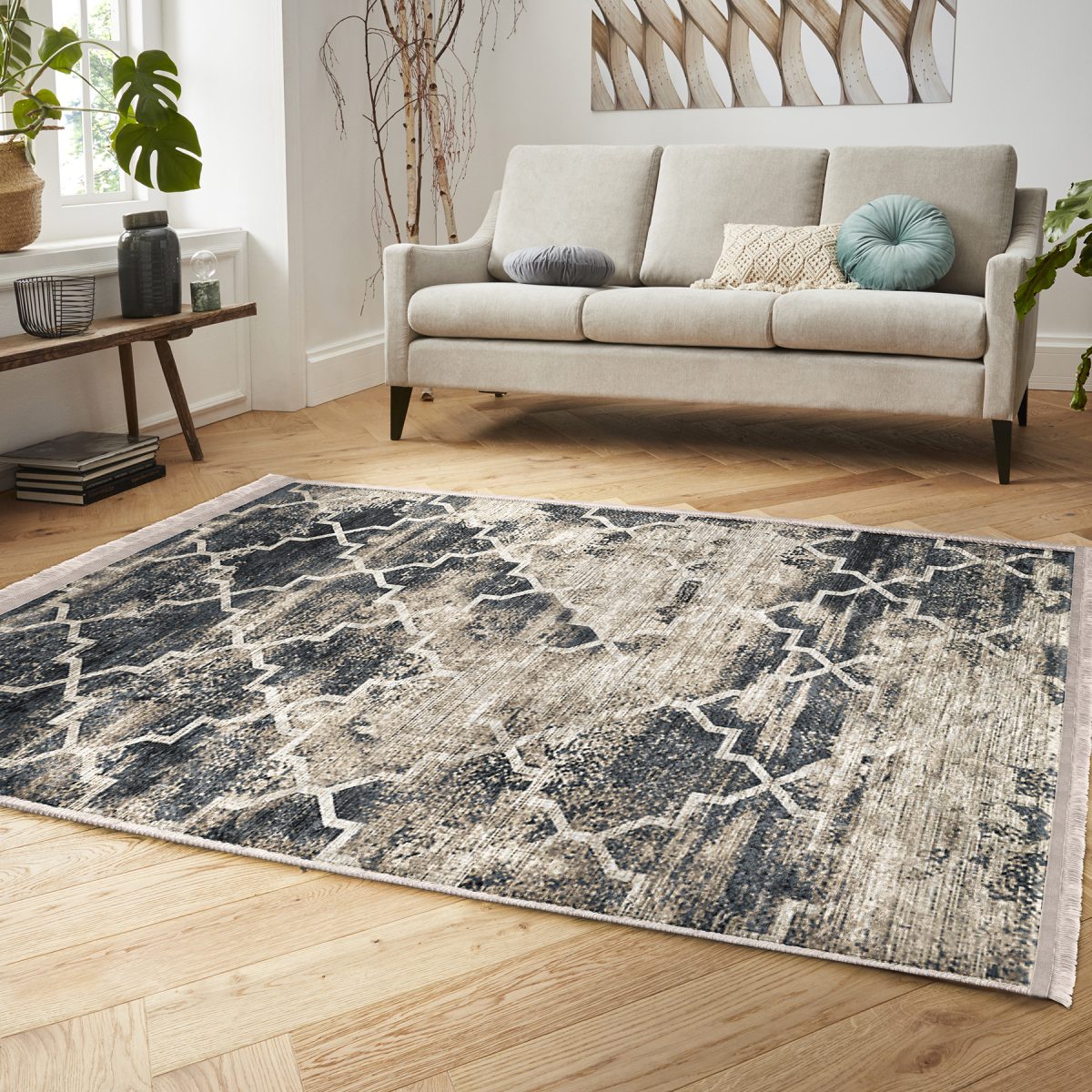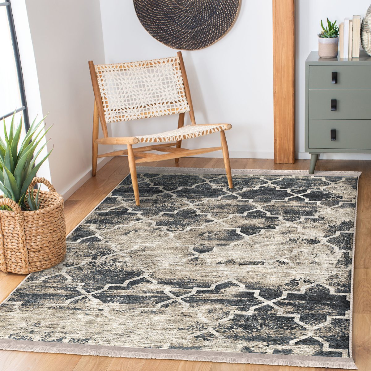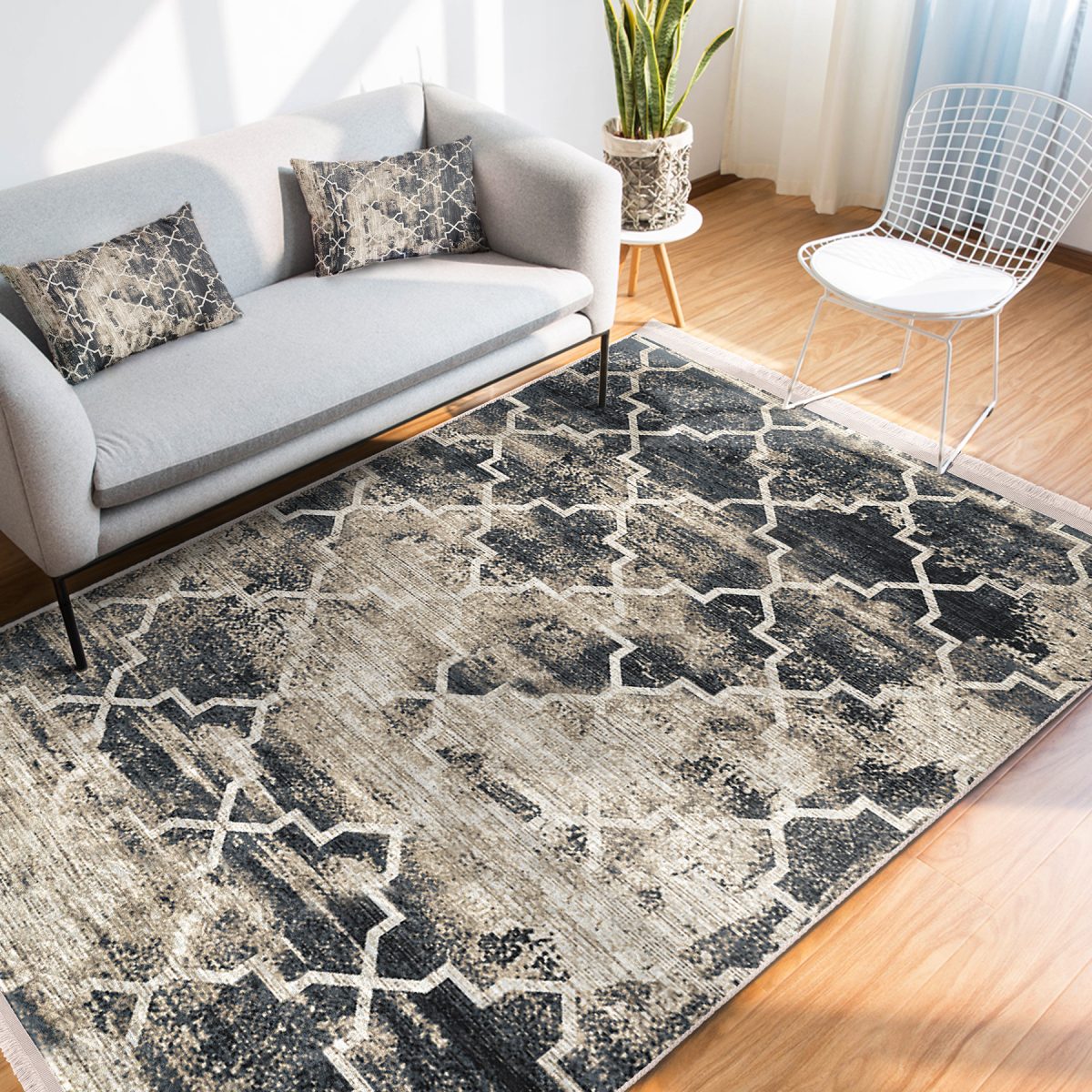 Gri Krem Zeminde Damalı Motifli Art Deco Desenli Sade & Şık Klasik Salon & Oturma Odası Koridor & Antre Dijital Baskılı Makinede Yıkanabilir Kaymaz Taban Saçaklı Halı