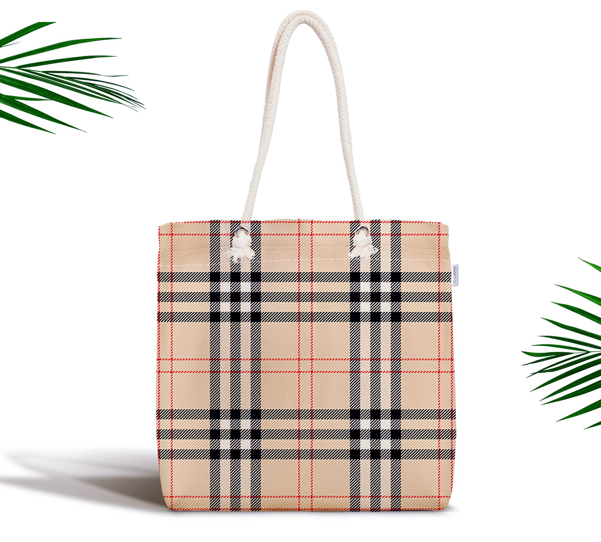 Krem Zeminli Ekose Desenli Fermuarlı Modern Kumaş Çanta