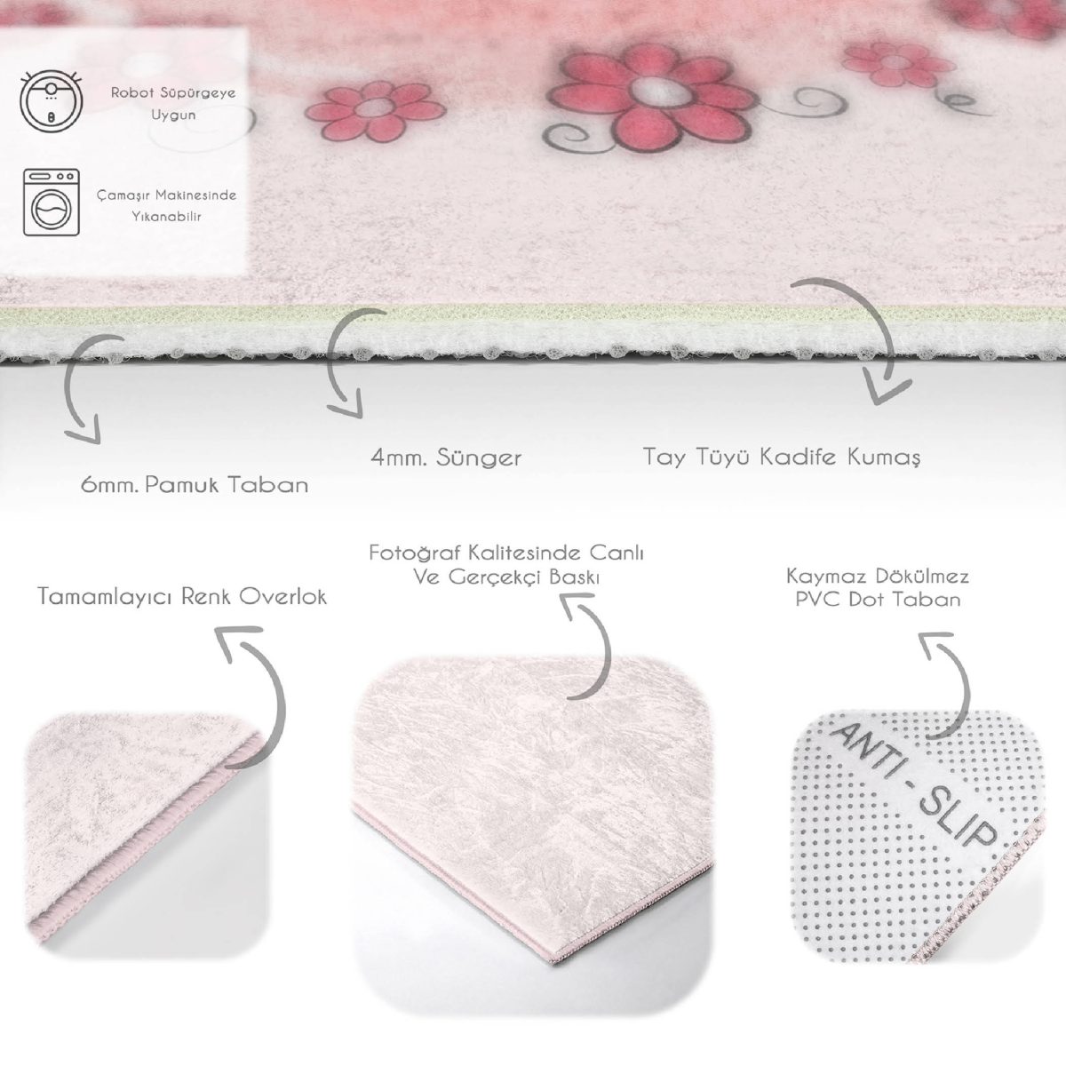 Pembe Zeminde Papatya Desenli Çocuk & Genç Odası Makinede Yıkanabilir Kaymaz Tabanlı Yuvarlak Çocuk Halısı