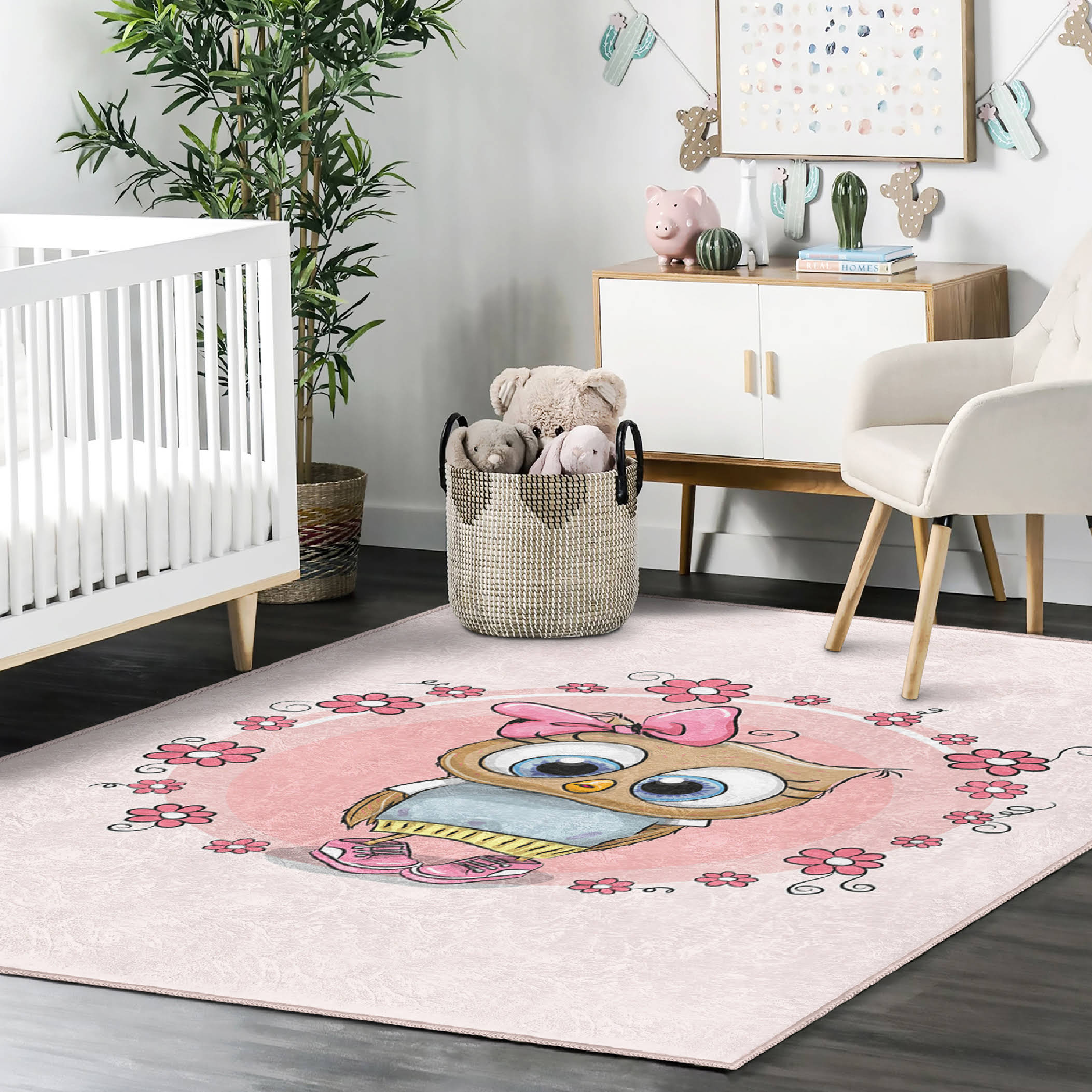 Kurdeleli Sevimli Baykuş Çocuk & Genç Odası Makinede Yıkanabilir Kaymaz Tabanlı Pamuk Tabanlı Özel Ölçü Leke Tutmaz Dikdörtgen Çocuk Halısı