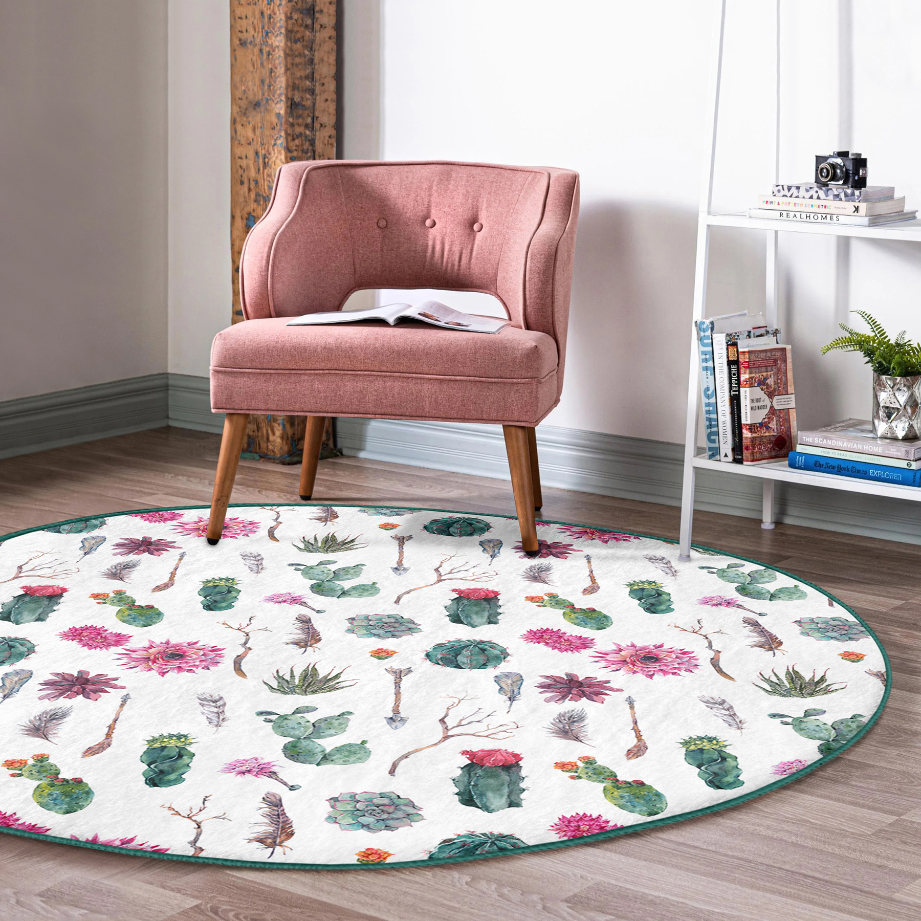 Kuş Tüyü Motifli Çöl Bitkisi Desenli Modern Dijital Baskılı Yeşil Mutfak Yıkanabilir Kaymaz Tabanlı Yuvarlak Halı