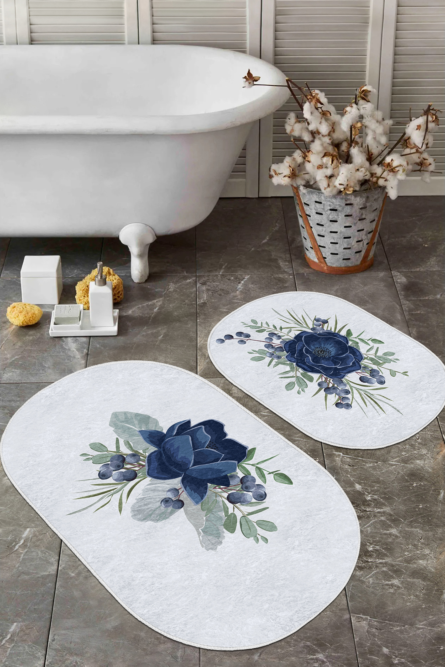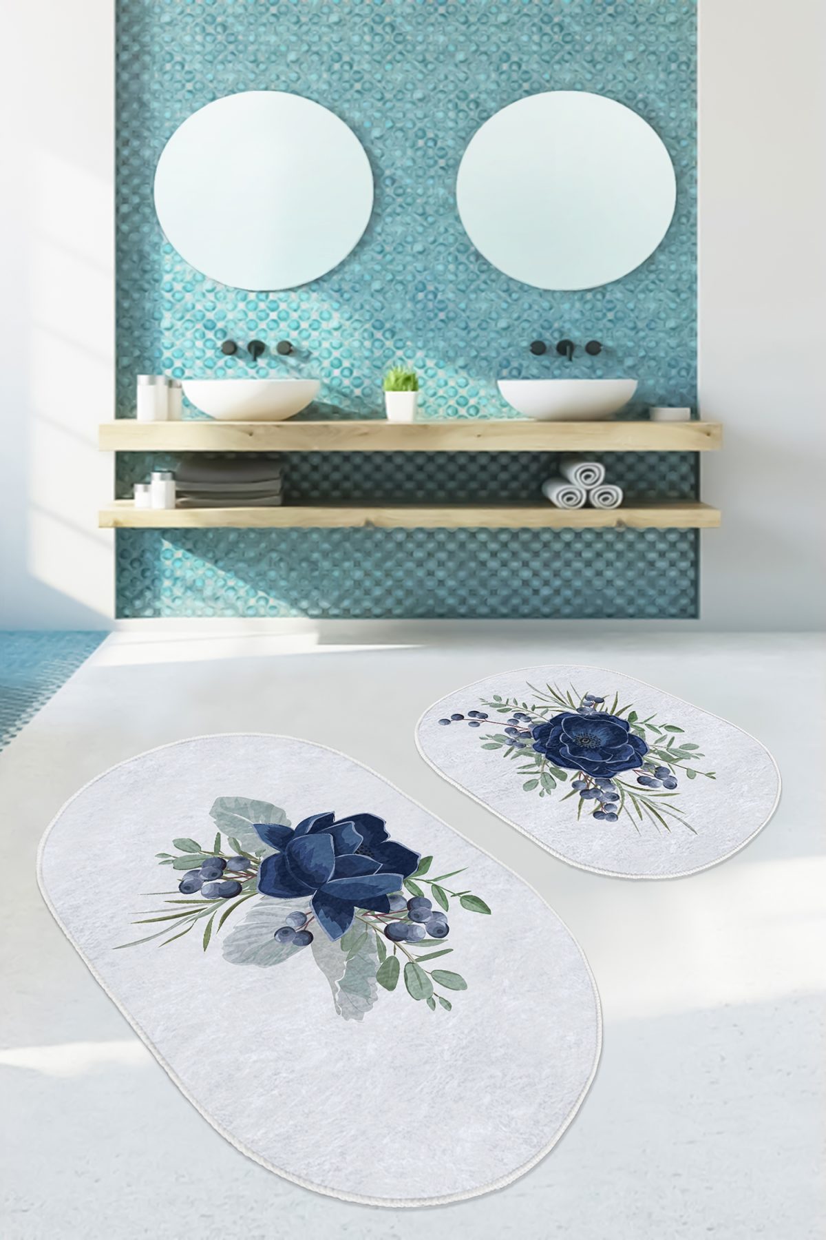 Lacivert Gül Tasarımlı Dijital Baskılı 2’li Oval Kaymaz Tabanlı Banyo & Mutfak Paspas Takımı